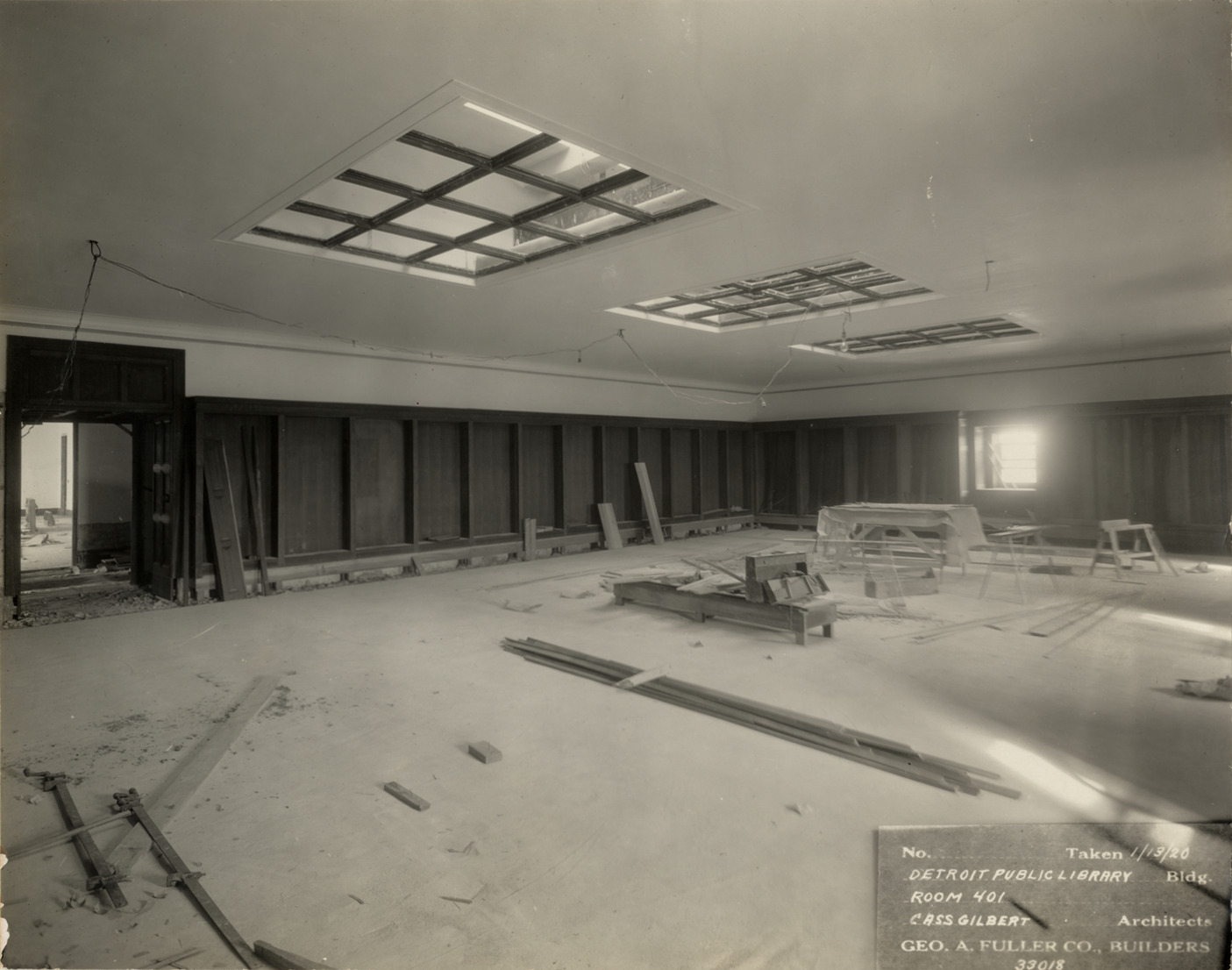 View of room 401, Main Library, Detroit Public Library during construction. Bookshelves under construction line walls; sawhorses and other carpentry materials in center of room. Skylights in ceiling. Printed on front: "No. [blank]. Taken 1/13/20. Detroit Public Library bldg., room 401. Cass Gilbert, architects. Geo. A. Fuller Co., builders, 33018." Stamped on back: "Manning Bros., commercial photographers, 504-505 Lincoln Building, corner State and Park Sts., Detroit, Mich."
