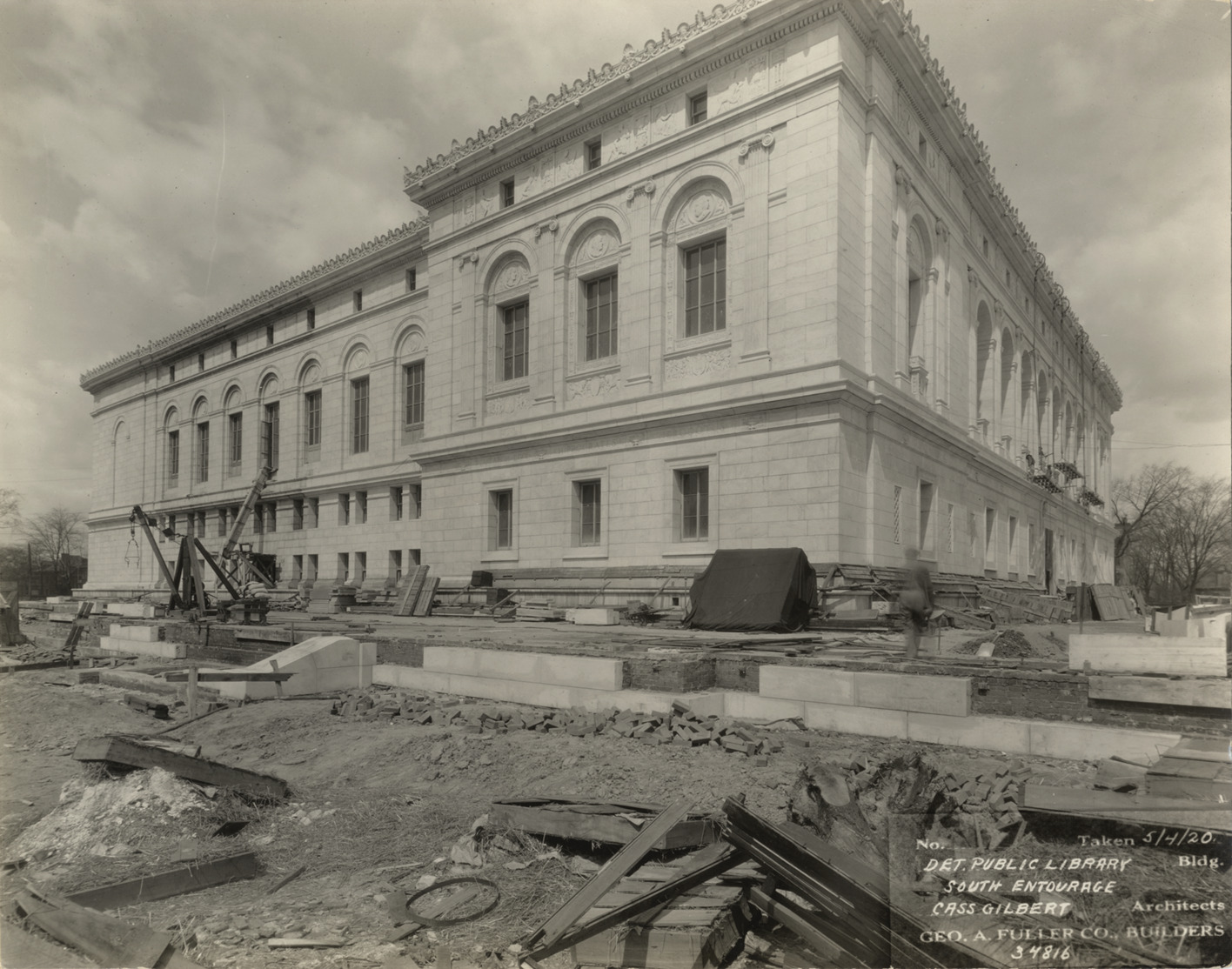 View of south entourage or terrace, Main Library, Detroit Public Library during construction. Building has arched windows framed by pilasters; decorative roof cornice. Construction materials and debris in foreground. Printed on front: "No. [blank]. Taken 5/4/20. Det. Public Library bldg., south entourage. Cass Gilbert, architects. Geo. A. Fuller Co., builders, 34816." Stamped on back: "Manning Bros., commercial photographers, 504-505 Lincoln Building, corner State and Park Sts., Detroit, Mich."