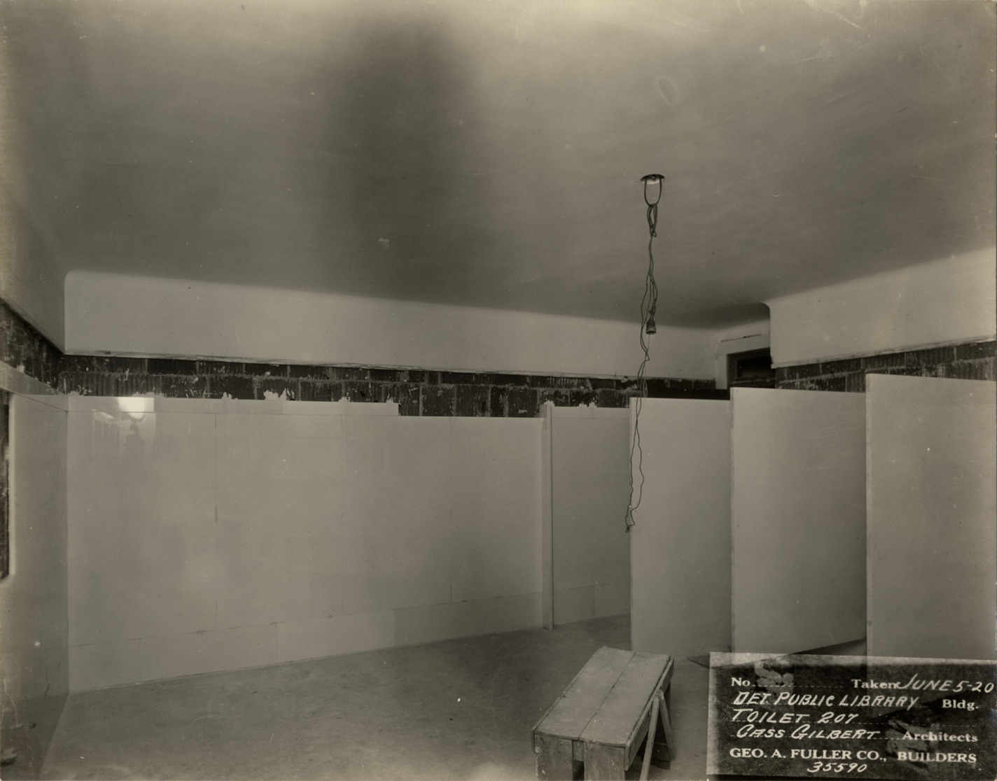 View of lavatory in Main Library, Detroit Public Library during construction. Toilet stalls along right walls; walls partially finished. Exposed light fixture hangs from ceiling. Printed on front: "No. [blank]. Taken June 5-20. Det. Public Library bldg., toilet 207. Cass Gilbert, architects. Geo. A. Fuller Co., builders, 35590." Stamped on back: "Manning Bros., commercial photographers, 504-505 Lincoln Building, corner State and Park Sts., Detroit, Mich."