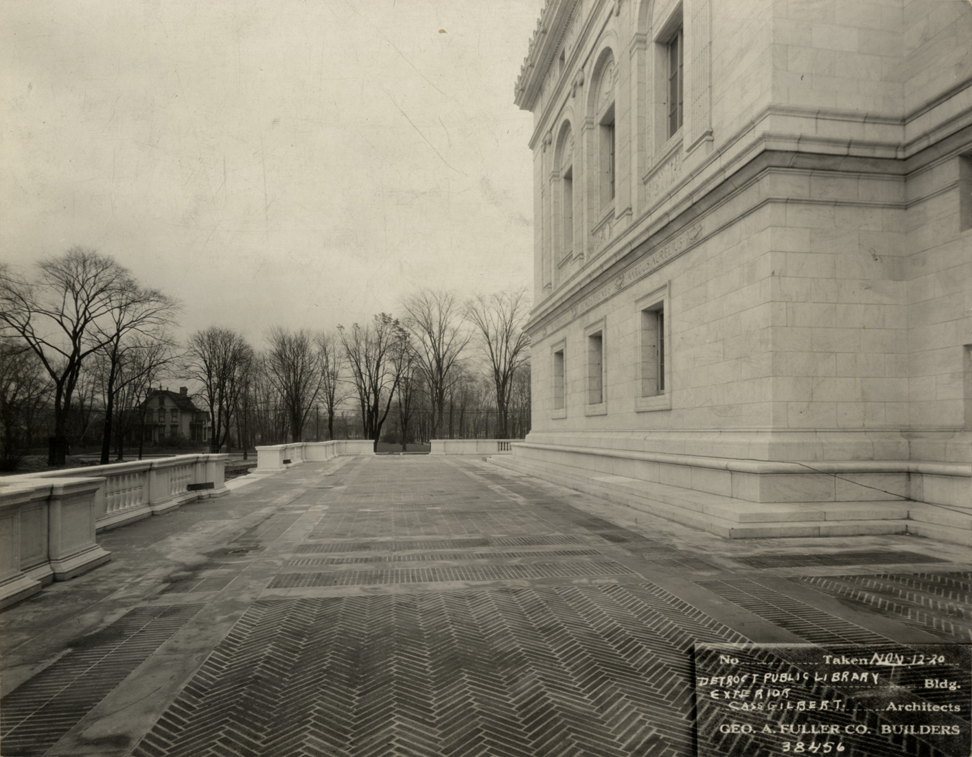 View of terrace and exterior of Main Library, Detroit Public Library during construction. Brick arranged in herringbone pattern; terrace bordered by balustrade. Printed on front: "No. [blank]. Taken Nov-12-20. Detroit Public Library bldg., exterior. Cass Gilbert, architects. Geo. A. Fuller Co., builders, 38456." Stamped on back: "Manning Bros., commercial photographers, 504-505 Lincoln Building, corner State and Park Sts., Detroit, Mich."