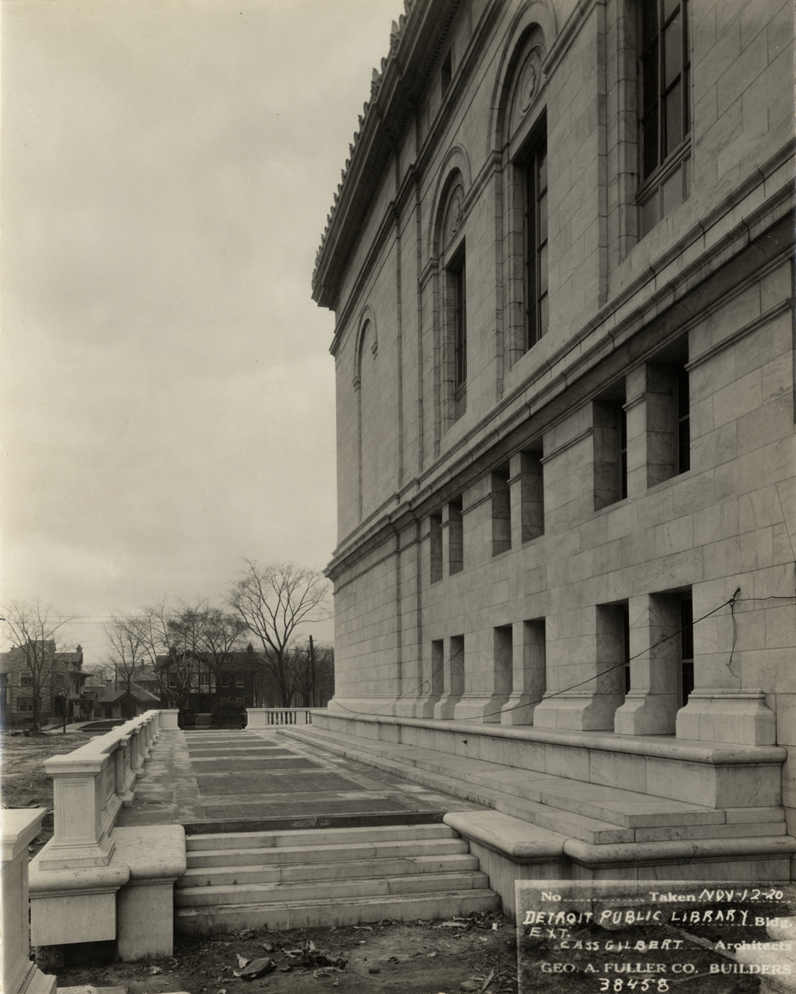 View of terrace and exterior of Main Library, Detroit Public Library during construction. Steps lead to terrace surrounded by balustrade. Houses in background. Printed on front: "No. [blank]. Taken Nov-12-20. Detroit Public Library bldg., ext. Cass Gilbert, architects. Geo. A. Fuller Co., builders, 38458." Stamped on back: "Manning Bros., commercial photographers, 504-505 Lincoln Building, corner State and Park Sts., Detroit, Mich."