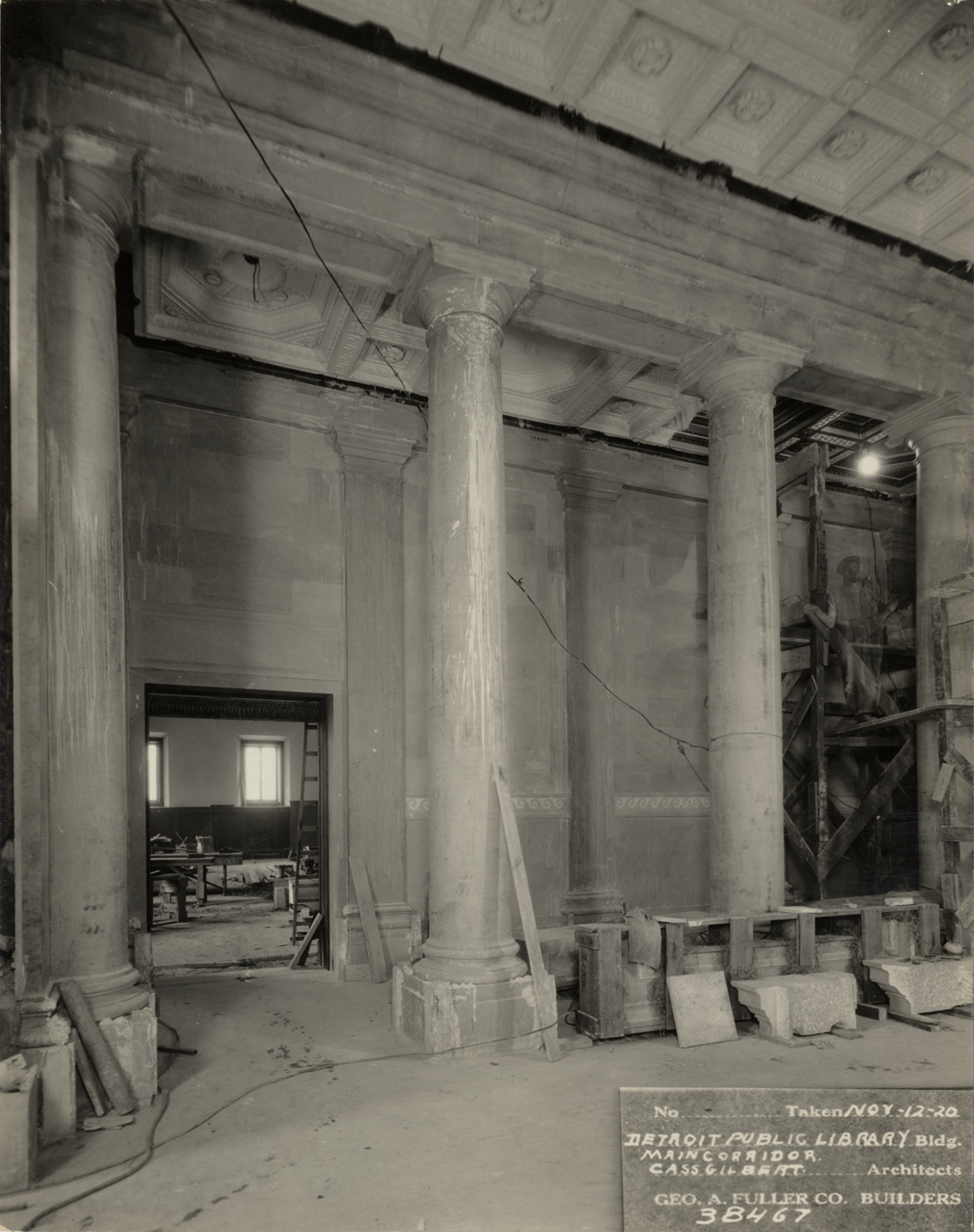 View of main corridor, Main Library, Detroit Public Library during construction. Corridor has pilasters, Doric columns and coffered ceiling. View into adjacent room containing construction materials; construction worker stands on scaffolding in hallway. Printed on front: "No. [blank]. Taken Nov-12-20. Detroit Public Library bldg., main corridor. Cass Gilbert, architects. Geo. A. Fuller Co., builders, 38467." Stamped on back: "Manning Bros., commercial photographers, 504-505 Lincoln Building, corner State and Park Sts., Detroit, Mich."