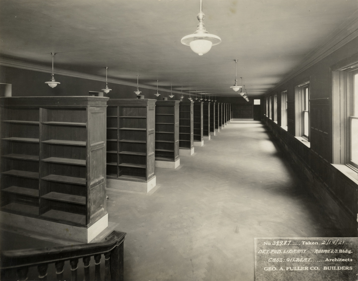View of room 423, Main Library, Detroit Public Library. Rows of bookcases; pendant light fixtures suspended from ceiling. Printed on front: "No. 39987. Taken 2/14/21. Det. Pub. Library bldg., room 423. Cass Gilbert, architects. Geo. A. Fuller Co., builders." Stamped on back: "Manning Bros., commercial photographers, 504-505 Lincoln Building, corner State and Park Sts., Detroit, Mich."