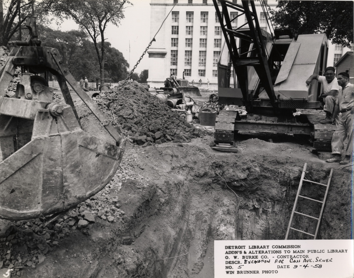 Excavation for Cass Avenue sewer, Main Library, Detroit Public Library. Construction workers stand next to power shovel; bulldozer in background. Printed on front: "Detroit Library Commission. Addn's & alterations to Main Public Library. O.W. Burke Co., contractor. Descr. excavation for Cass Ave. sewer. No. 5. Date 9-4-58. Win Brunner, photo."