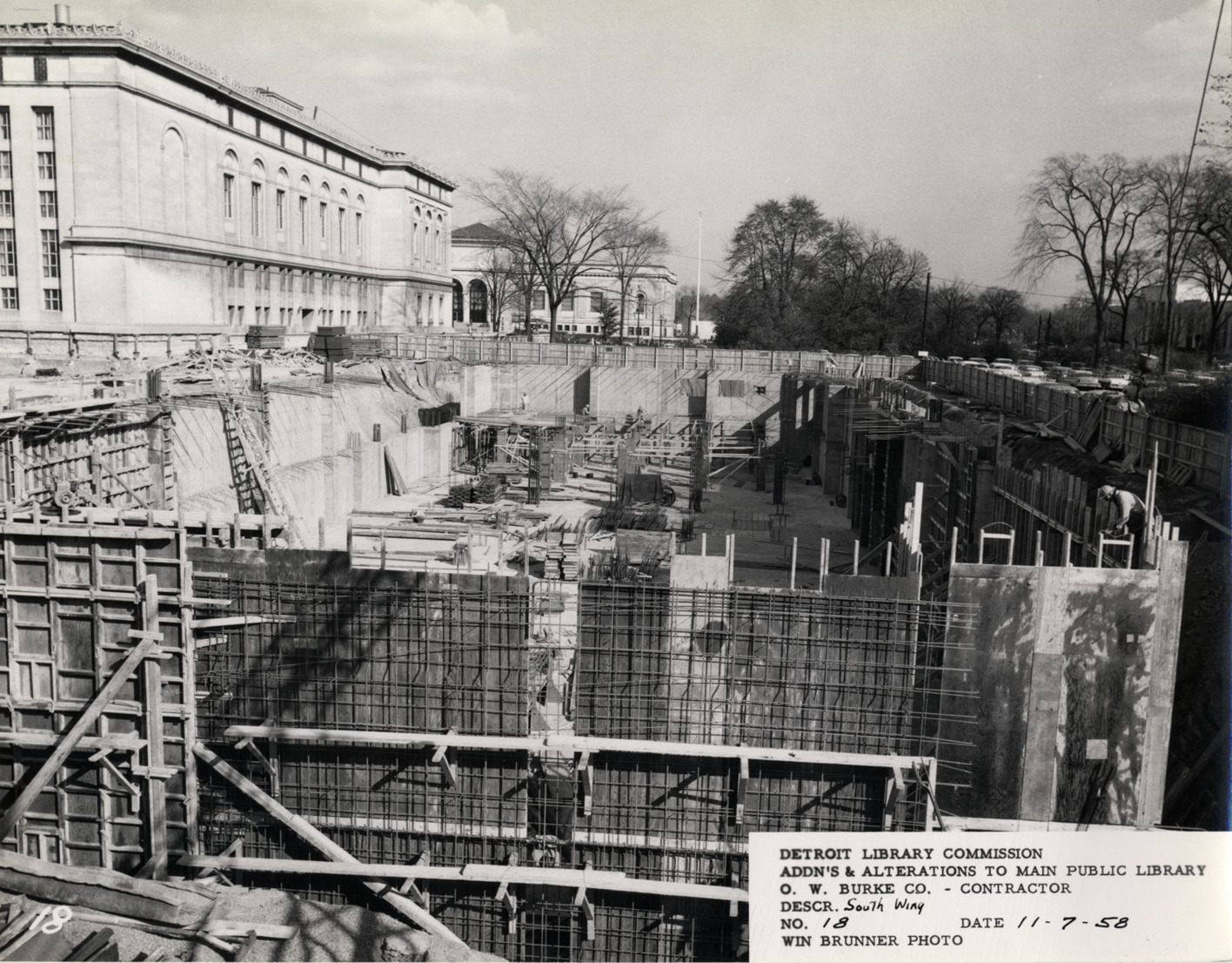 View of South Wing, Main Library, Detroit Public Library during construction. Printed on front: "Detroit Library Commission. Addn's & alterations to Main Public Library. O.W. Burke Co., contractor. Descr. South Wing. No. 18. Date 11-7-58. Win Brunner, photo."
