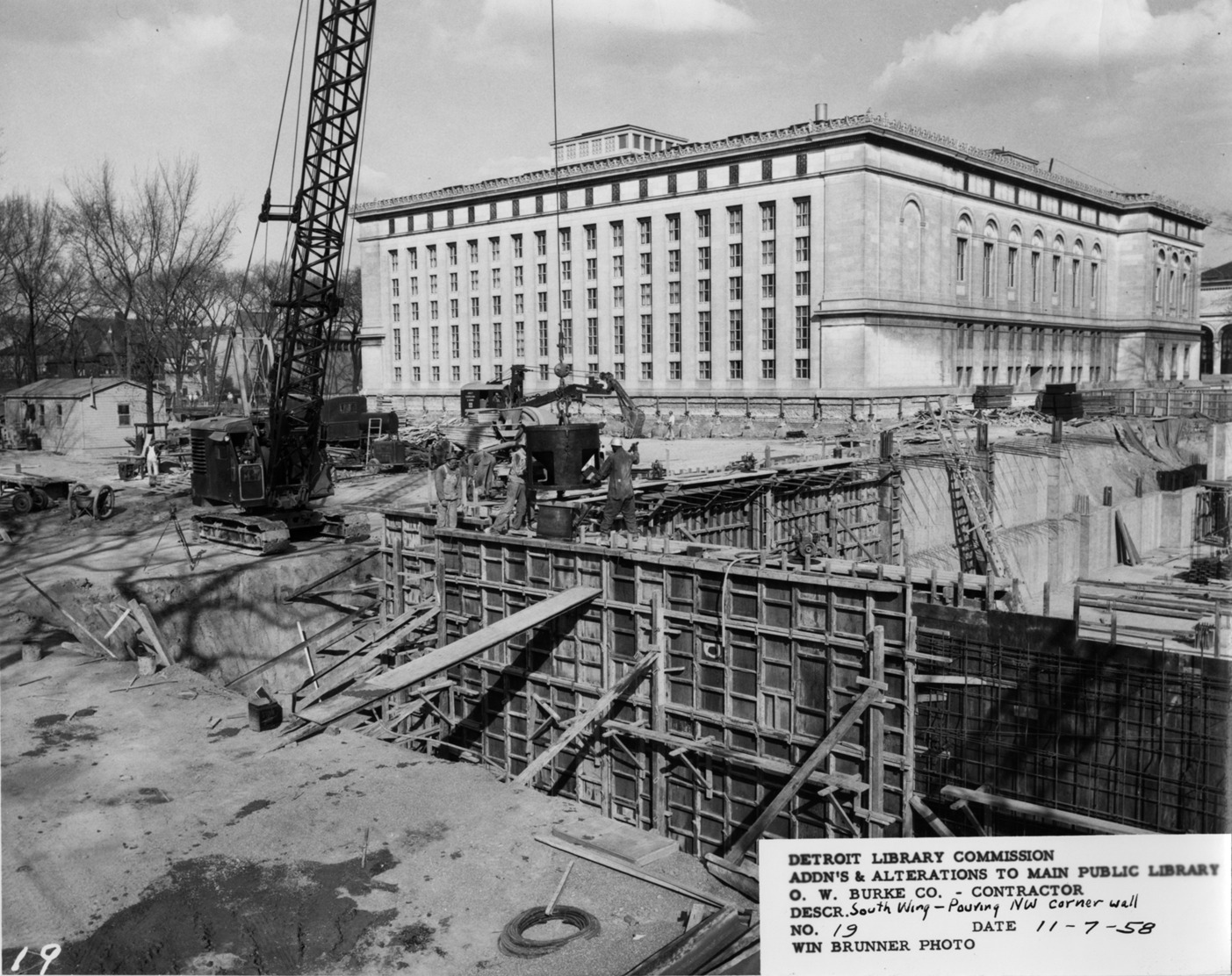 View of South Wing, Main Library, Detroit Public Library during construction. Construction workers pour concrete for walls; crane on left. Printed on front: "Detroit Library Commission. Addn's & alterations to Main Public Library. O.W. Burke Co., contractor. Descr. South Wing, pouring n.w. corner wall. No. 19. Date 11-7-58. Win Brunner, photo."