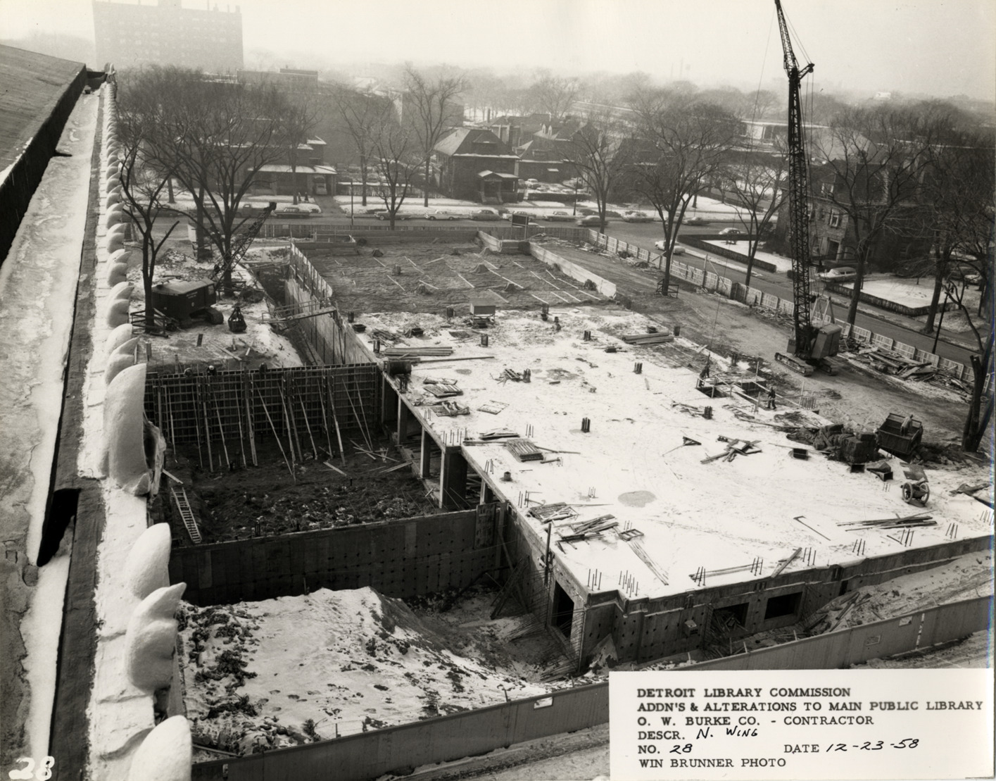 View of North Wing, Main Library, Detroit Public Library during construction. Cranes and construction materials on site. Printed on front: "Detroit Library Commission. Addn's & alterations to Main Public Library. O.W. Burke Co., contractor. Descr. N. Wing. No. 28. Date 12-23-58. Win Brunner, photo."