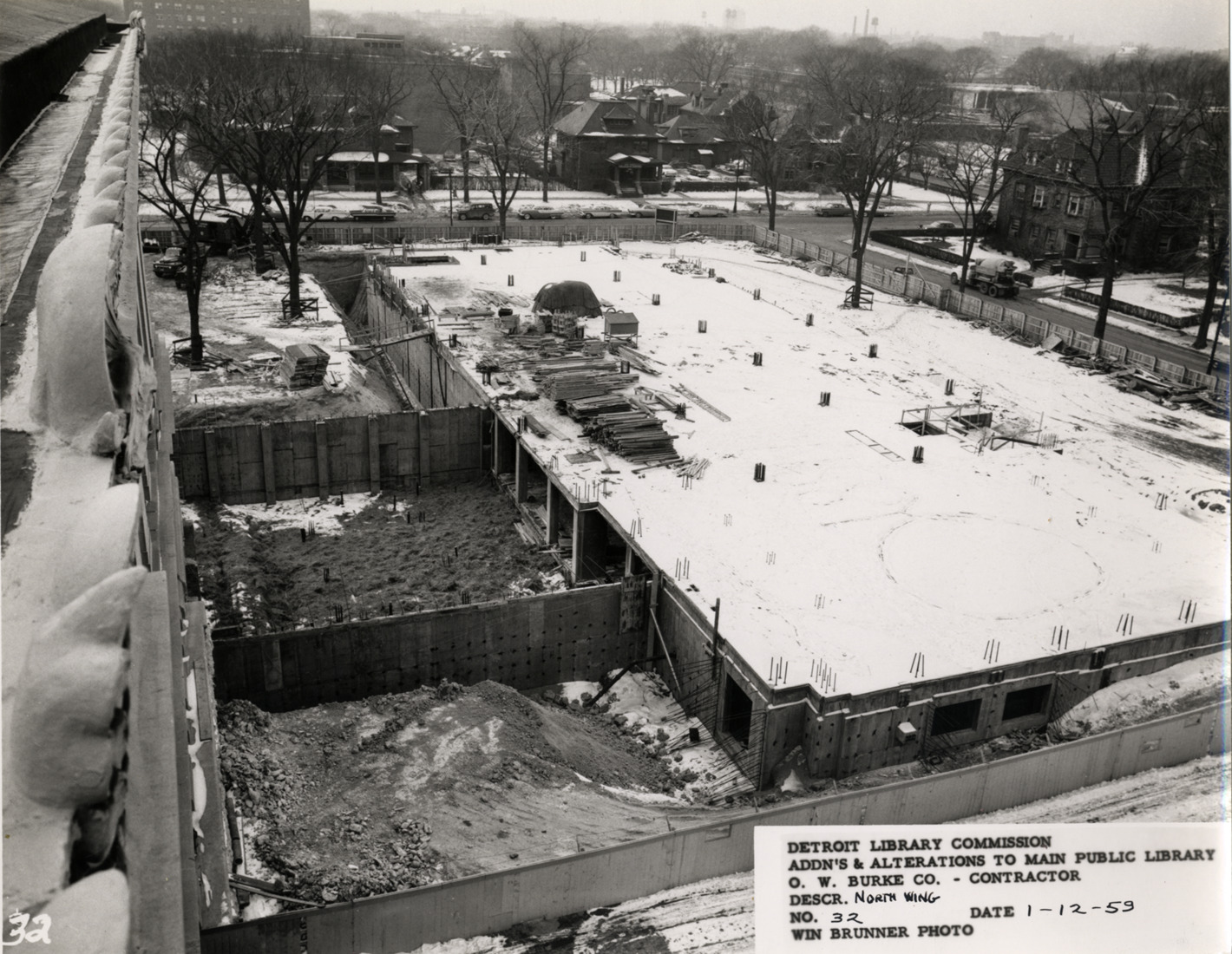 View of North Wing, Main Library, Detroit Public Library during construction. Snow covers construction site. Printed on front: "Detroit Library Commission. Addn's & alterations to Main Public Library. O.W. Burke Co., contractor. Descr. North Wing. No. 32. Date 1-12-59. Win Brunner, photo."