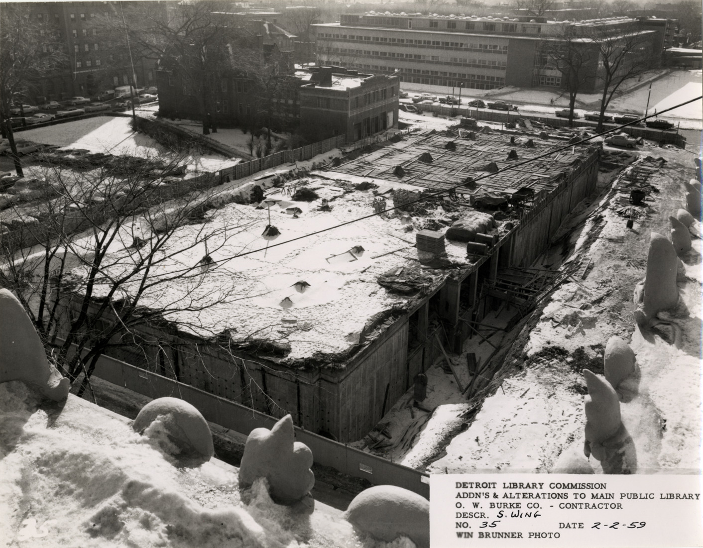 View of South Wing, Main Library, Detroit Public Library during construction. Snow covers construction site; old Technology building and Wayne State University in background. Printed on front: "Detroit Library Commission. Addn's & alterations to Main Public Library. O.W. Burke Co., contractor. Descr. S. Wing. No. 35. Date 2-2-59. Win Brunner, photo."
