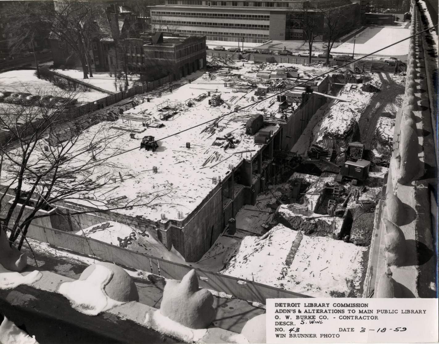 View of South Wing, Main Library, Detroit Public Library during construction. Snow covers construction site; old Technology building in background. Printed on front: "Detroit Library Commission. Addn's & alterations to Main Public Library. O.W. Burke Co., contractor. Descr. S. Wing. No. 43. Date 3-18-59. Win Brunner, photo."