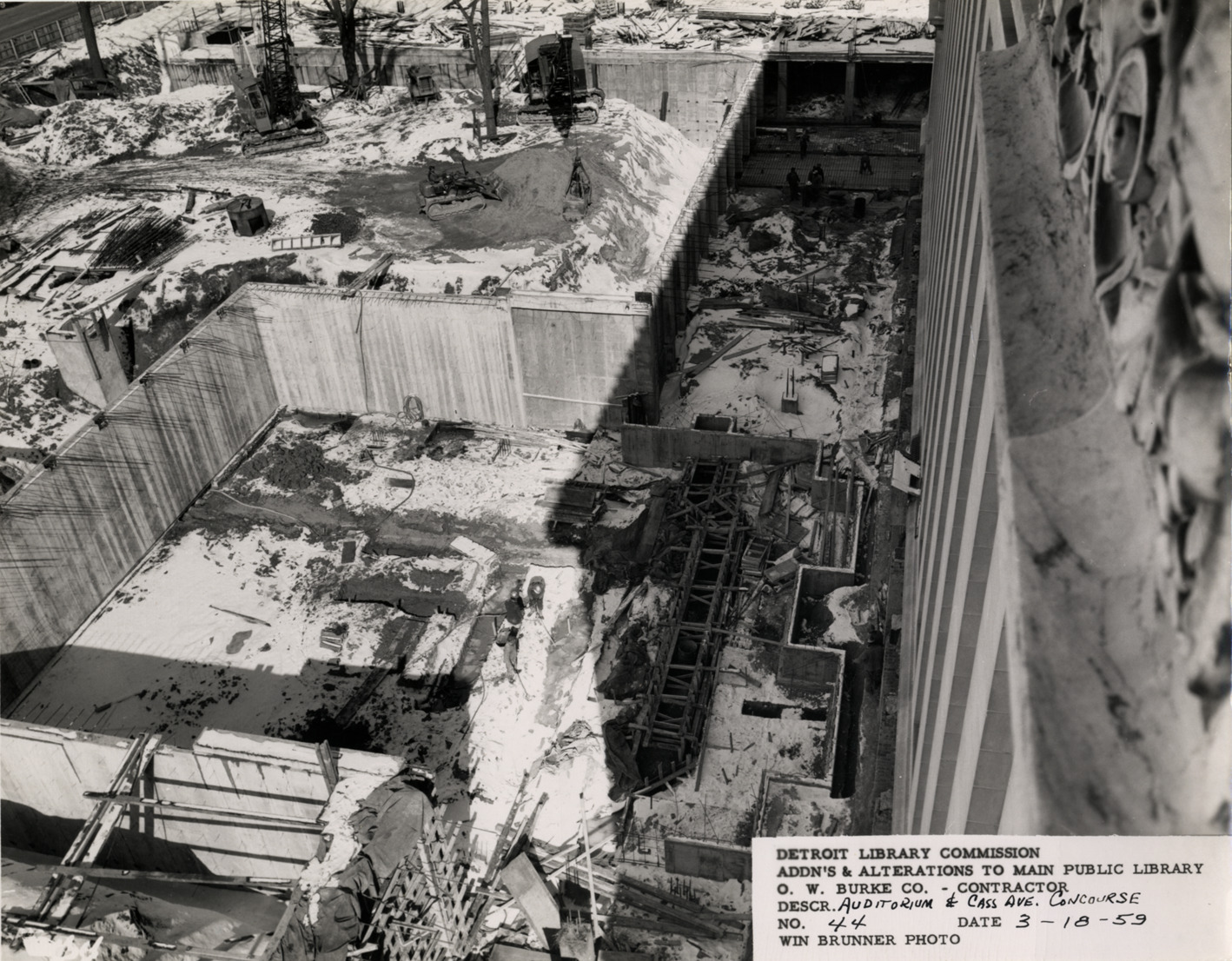 Bird's-eye view of auditorium and Cass Avenue concourse, Main Library, Detroit Public Library during construction. Construction workers, building materials and construction equipment on site. Printed on front: "Detroit Library Commission. Addn's & alterations to Main Public Library. O.W. Burke Co., contractor. Descr. auditorium & Cass Ave. concourse. No. 44. Date 3-18-59. Win Brunner, photo."