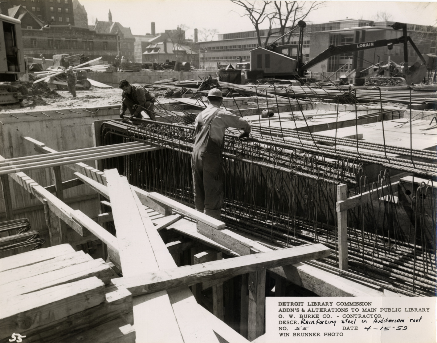 View of auditorium roof construction, Main Library, Detroit Public Library. Construction workers install reinforced steel. Printed on front: "Detroit Library Commission. Addn's & alterations to Main Public Library. O.W. Burke Co., contractor. Descr. reinforcing steel in auditorium roof. No. 55. Date 4-15-59. Win Brunner, photo."
