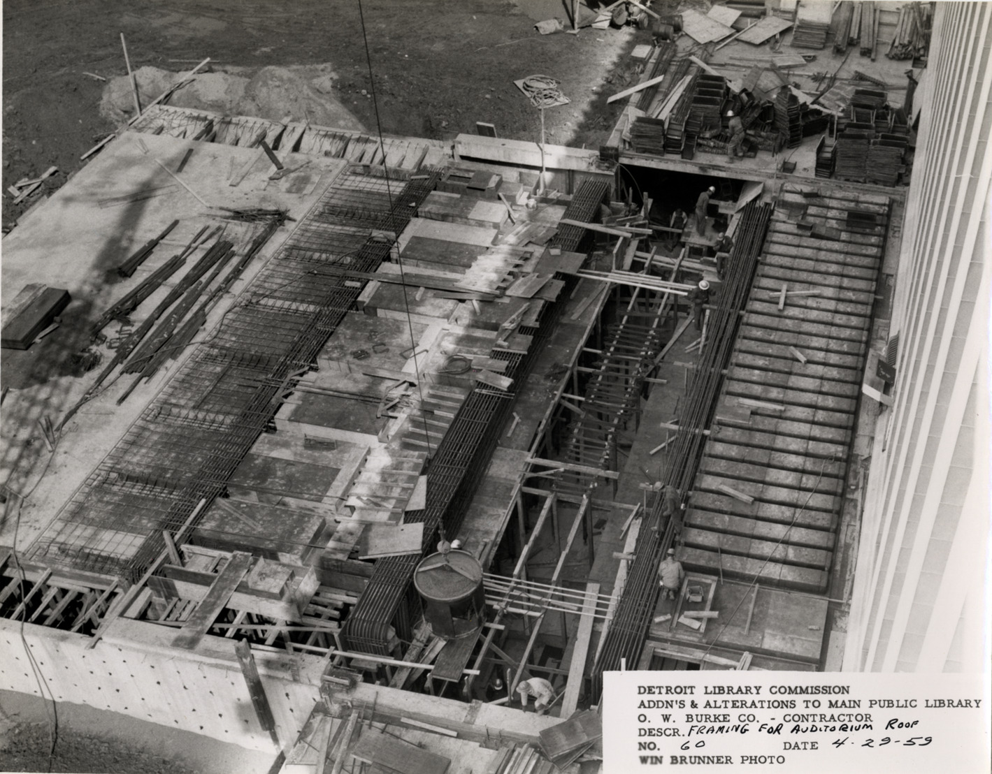 Bird's-eye view of framing for auditorium roof, Main Library, Detroit Public Library during construction. Printed on front: "Detroit Library Commission. Addn's & alterations to Main Public Library. O.W. Burke Co., contractor. Descr. framing for auditorium roof. No. 60. Date 4-29-59. Win Brunner, photo."