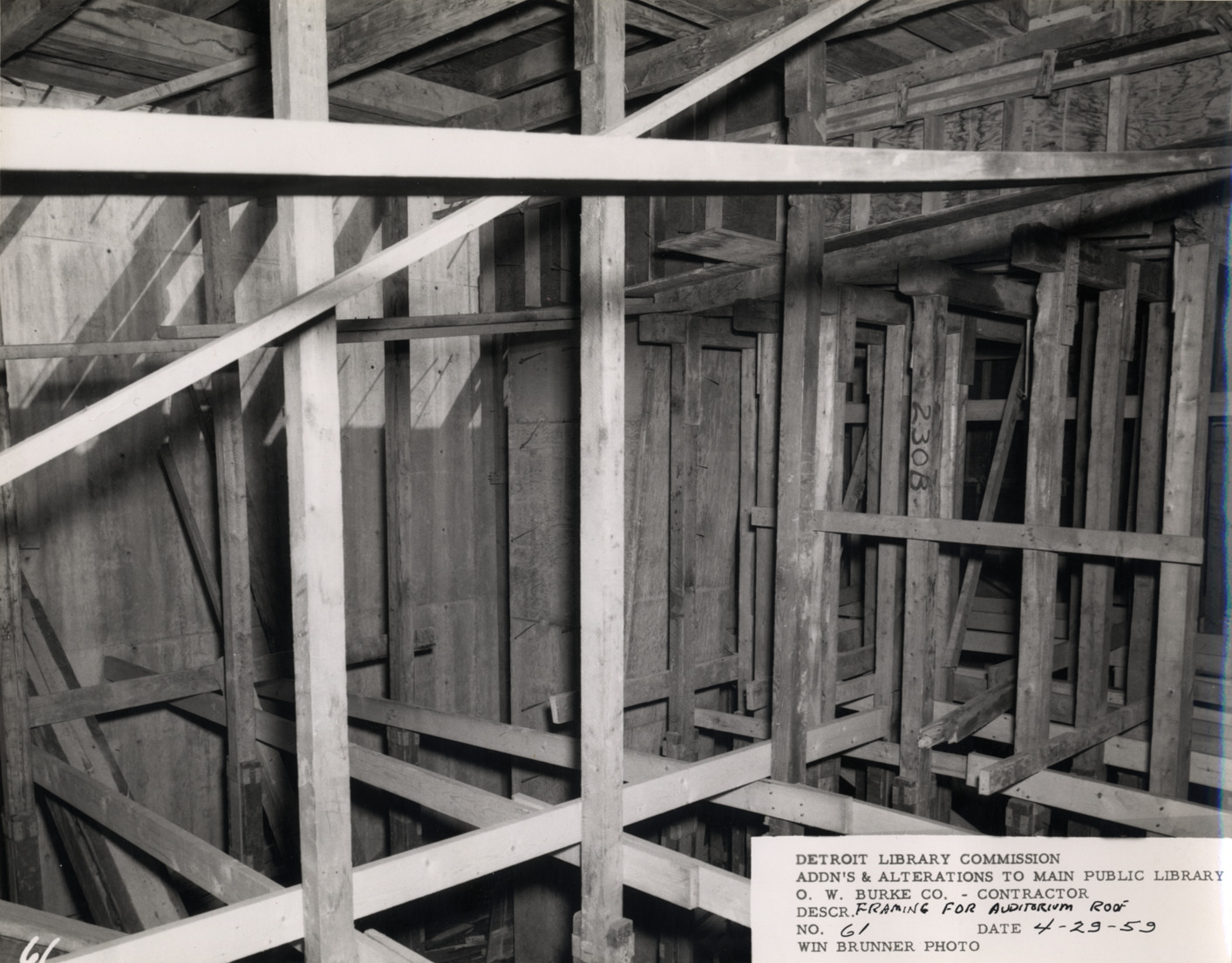 Interior view of framing for auditorium roof, Main Library, Detroit Public Library during construction. Printed on front: "Detroit Library Commission. Addn's & alterations to Main Public Library. O.W. Burke Co., contractor. Descr. framing for auditorium roof. No. 61. Date 4-29-59. Win Brunner, photo."