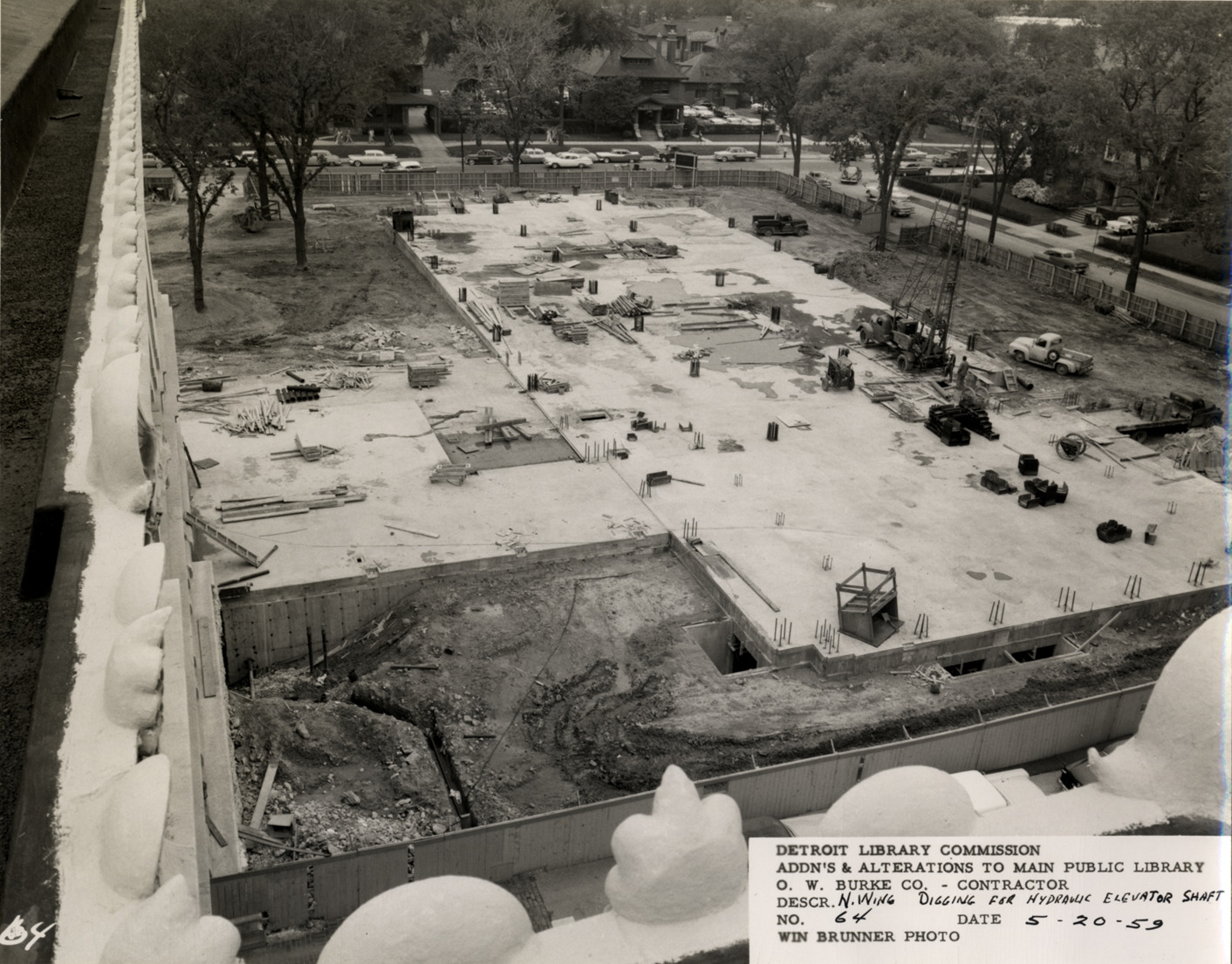 View of excavation of hydraulic elevator shaft, North Wing, Main Library, Detroit Public Library. Printed on front: "Detroit Library Commission. Addn's & alterations to Main Public Library. O.W. Burke Co., contractor. Descr. N. Wing, digging for hydraulic elevator shaft. No. 64. Date 5-20-59. Win Brunner, photo."