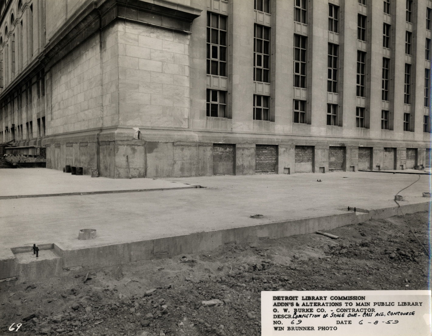 View of Cass Avenue concourse, Main Library, Detroit Public Library during construction. Printed on front: "Detroit Library Commission. Addn's & alterations to Main Public Library. O.W. Burke Co., contractor. Descr. completion of stage one, Cass Ave. concourse. No. 69. Date 6-8-59. Win Brunner, photo."