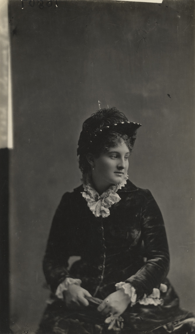 Portrait of Mrs. Boeing, holding a pair of gloves. Mrs. Boeing wears velvet jacket, feather-trimmed hat and lace collar. Handwritten on back: "Mrs. Boeing."