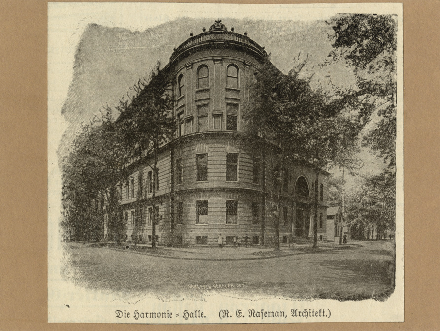 Favorite this☆ Harmonie Hall Description: Engraving depicting Harmonie Hall. Stone building has curved corner and balustrade on roof. Printed on front: "Die Harmonie Halle, R.E. Rafeman, architett. Van Leyen-Hensler, Det." Details Resource ID: bh006525 Creator: Van Leyen-Hensler Company Subject: Clubhouses--Michigan--Detroit Halls--Michigan--Detroit Photographic prints Engraving Date Issued: Unknown year Format: 1 photographic print mounted on stock ; image 4.5 x 4.75 in. Member of: Burton Historical Collection Filing Location: D/Organizations-Harmonie Society Rights: Physical rights are retained by DPL. Copyright is retained in accordance with U.S. copyright laws.