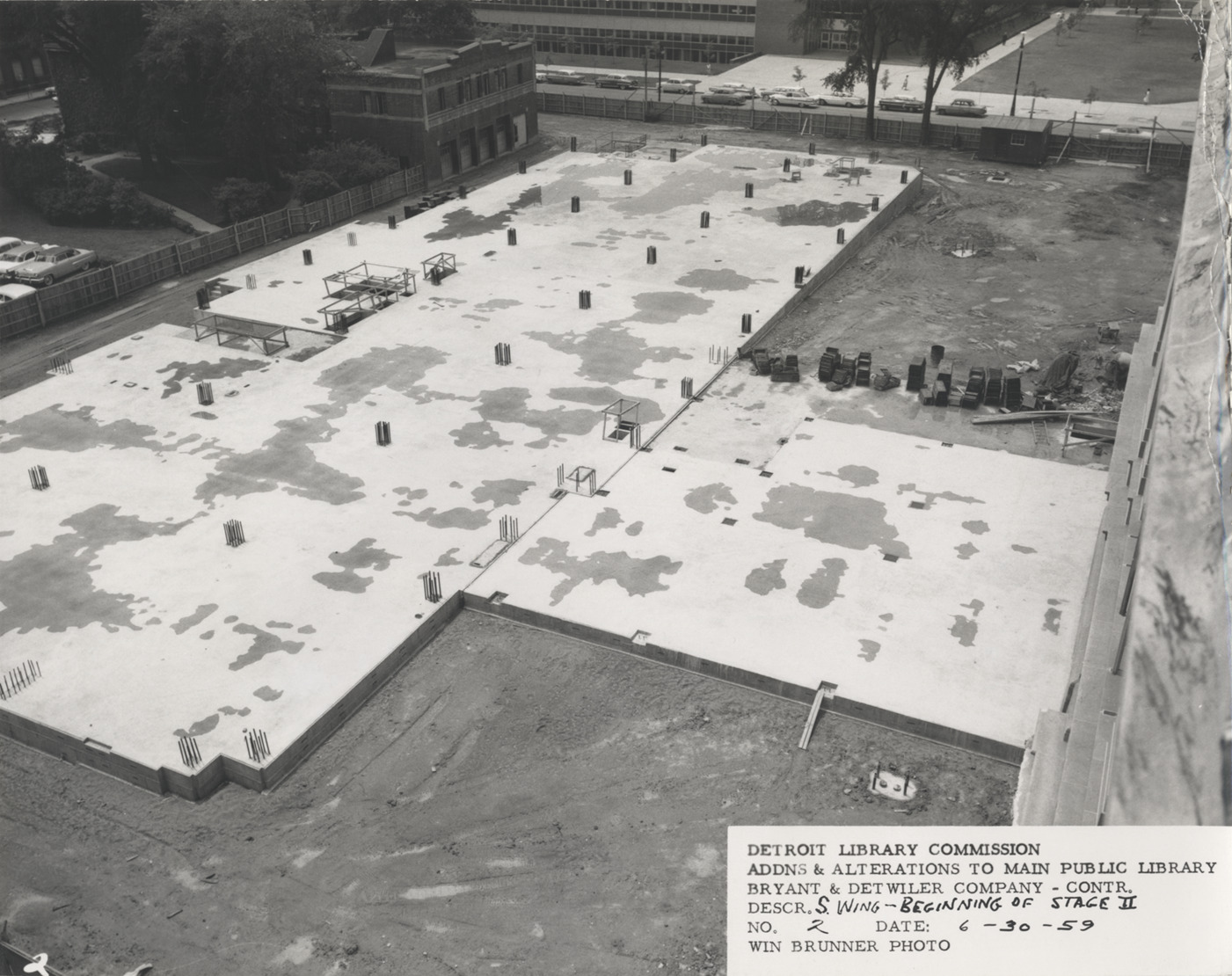 View of foundation for South Wing, Main Library, Detroit Public Library during construction. Foundation inside fenced area; buildings in background. Printed on front: "Detroit Library Commission. Addns & alterations to Main Public Library. Bryant & Detwiler Company, contr. Descr. S. Wing, beginning of Stage II. No. 2. Date: 6-30-59. Win Brunner, photo."