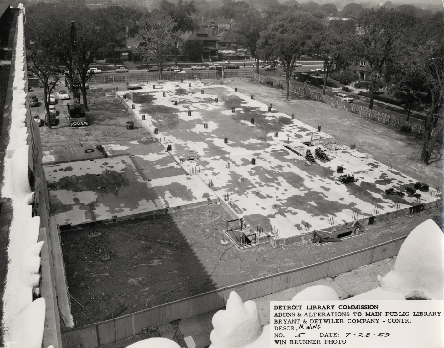 View of foundation for North Wing, Main Library, Detroit Public Library during construction. Foundation inside fenced area; houses, automobiles and trees in background. Printed on front: "Detroit Library Commission. Addns & alterations to Main Public Library. Bryant & Detwiler Company, contr. Descr. N. Wing. No. 5. Date: 7-28-59. Win Brunner, photo."