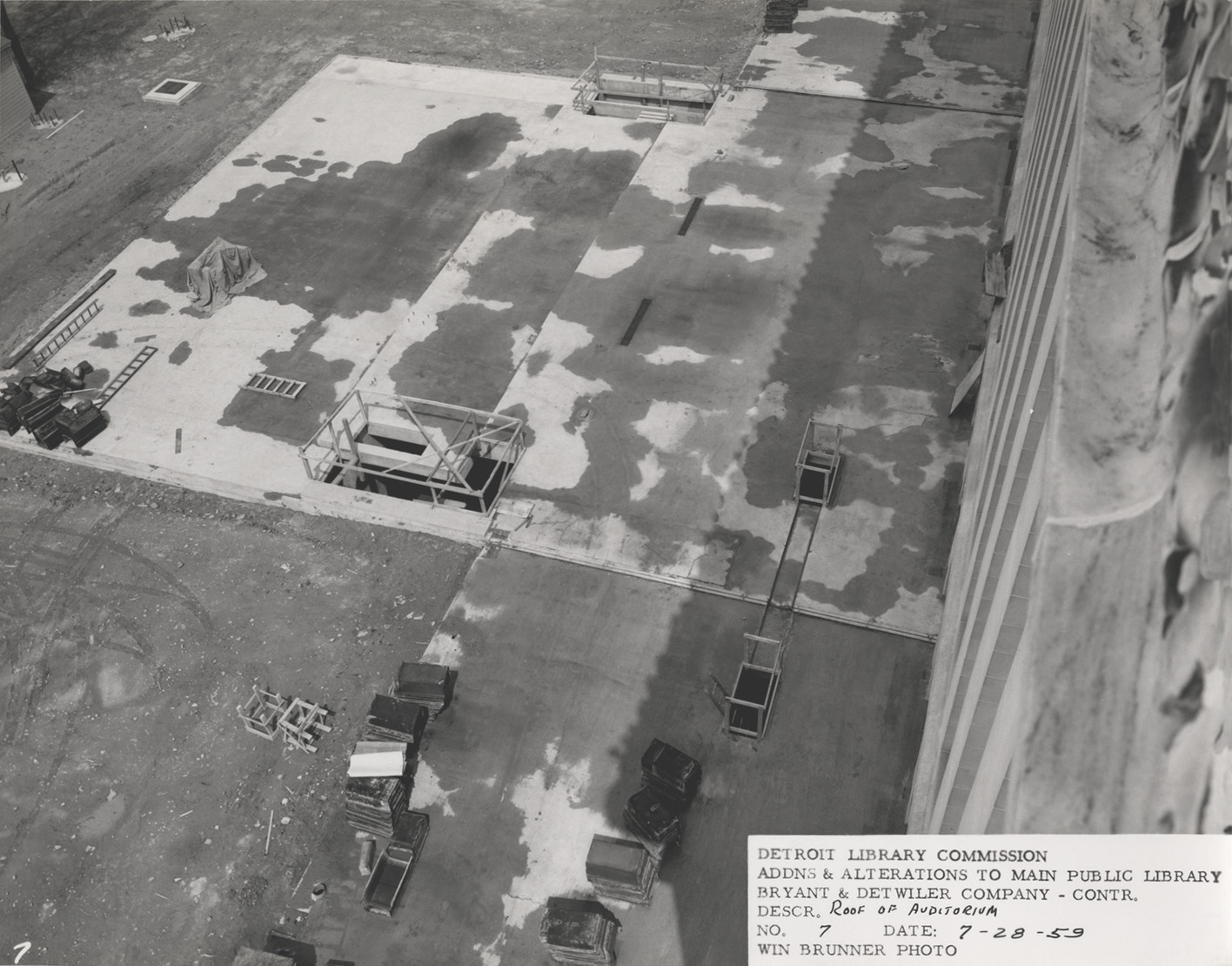 View of auditorium roof, Main Library, Detroit Public Library during construction. Construction materials on site. Printed on front: "Detroit Library Commission. Addns & alterations to Main Public Library. Bryant & Detwiler Company, contr. Descr. roof of auditorium. No. 7. Date: 7-28-59. Win Brunner, photo."