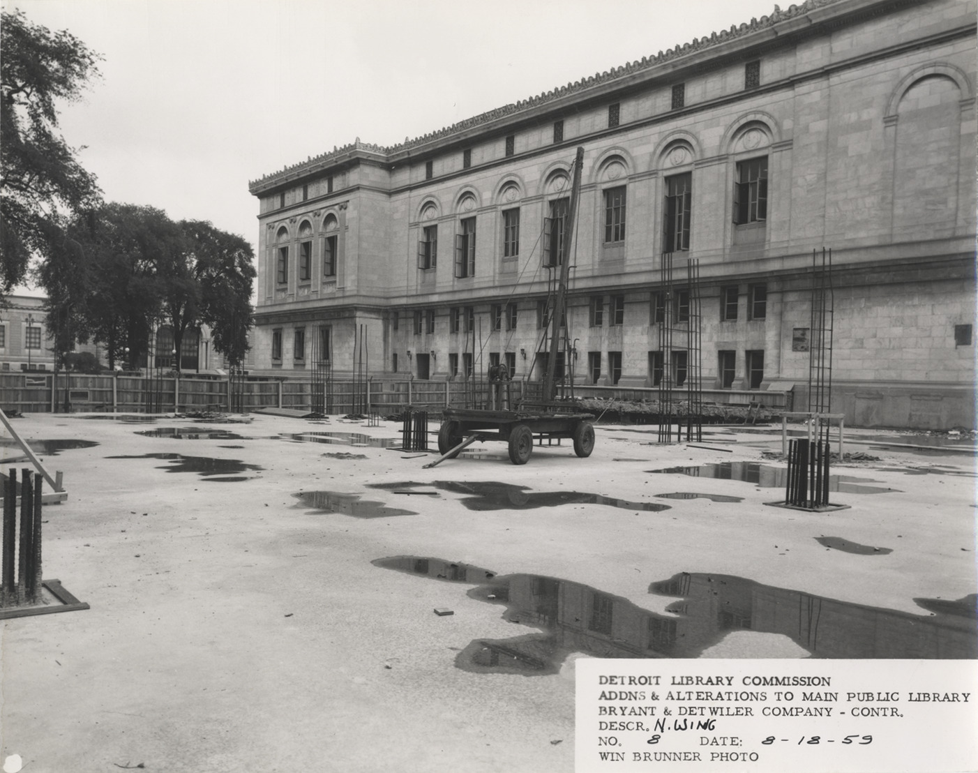 View of construction site for North Wing, Main Library, Detroit Public Library. Library building in background; construction equipment and foundation in foreground. Printed on front: "Detroit Library Commission. Addns & alterations to Main Public Library. Bryant & Detwiler Company, contr. Descr. N. Wing. No. 8. Date: 8-18-59. Win Brunner, photo."