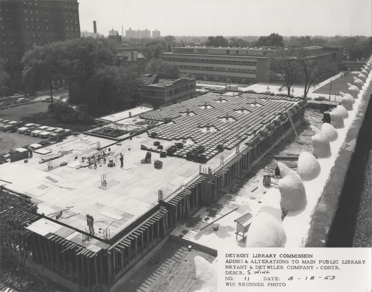 View of South Wing, Main Library, Detroit Public Library during construction. Construction workers stand atop structural framework amid construction materials. Wayne State University in background. Printed on front: "Detroit Library Commission. Addns & alterations to Main Public Library. Bryant & Detwiler Company, contr. Descr. S. Wing. No. 11. Date: 8-18-59. Win Brunner, photo."
