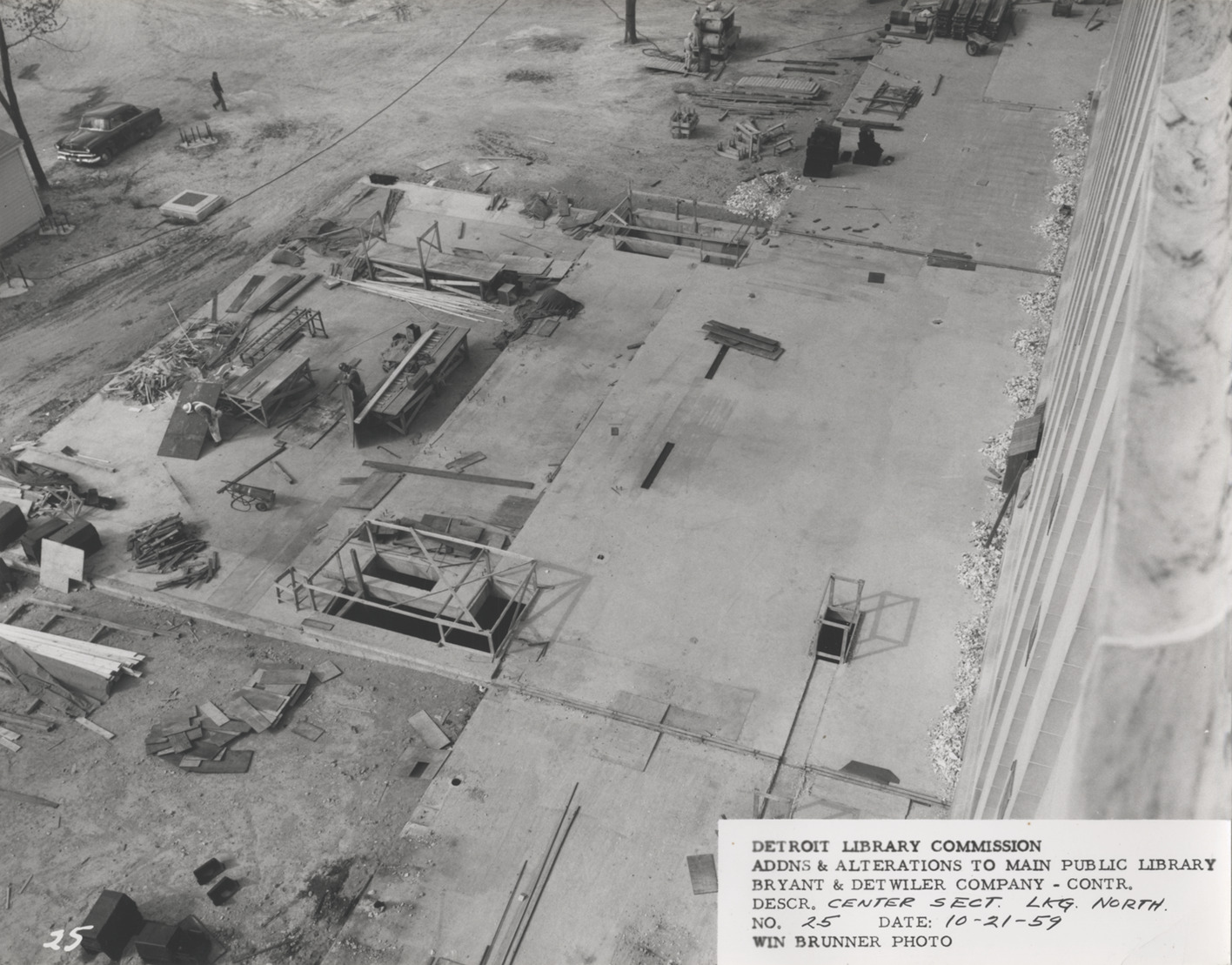 View of auditorium roof and concourse floor, Main Library, Detroit Public Library during construction, facing north. Construction workers, materials and equipment on site. Printed on front: "Detroit Library Commission. Addns & alterations to Main Public Library. Bryant & Detwiler Company, contr. Descr. center sect. lkg. north. No. 25. Date: 10-21-59. Win Brunner, photo."