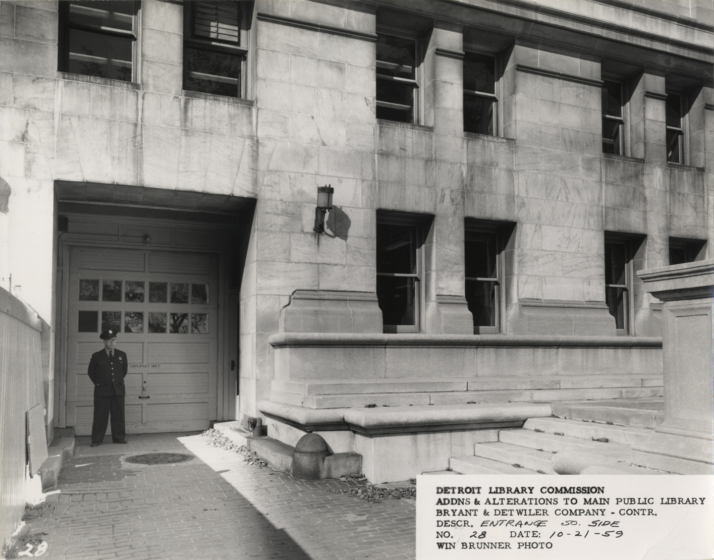 View of uniformed security guard standing in front of south entrance to Main Library, Detroit Public Library. Sign on door reads: "Employees only." Printed on front: "Detroit Library Commission. Addns & alterations to Main Public Library. Bryant & Detwiler Company, contr. Descr. entrance so. side. No. 28. Date: 10-21-59. Win Brunner, photo."