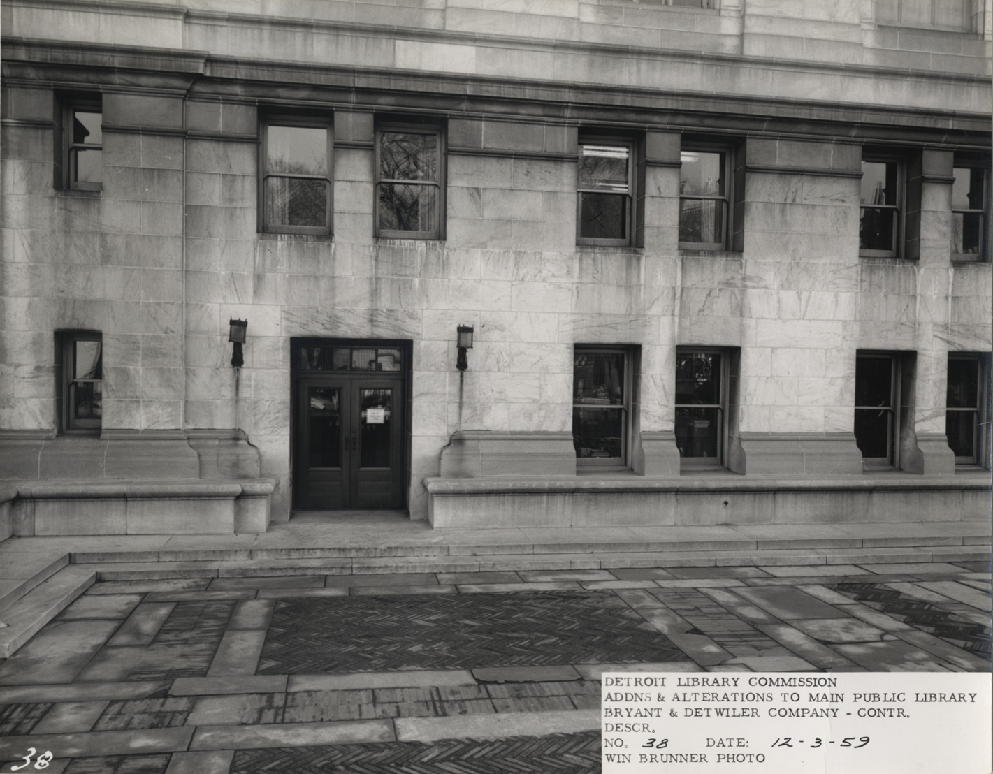 View of door to Main Library, Detroit Public Library on Cass Avenue side of building. Terrace in foreground. Construction materials and equipment on site. Printed on front: "Detroit Library Commission. Addns & alterations to Main Public Library. Bryant & Detwiler Company, contr. Descr. [blank]. No. 38. Date: 12-3-59. Win Brunner, photo."
