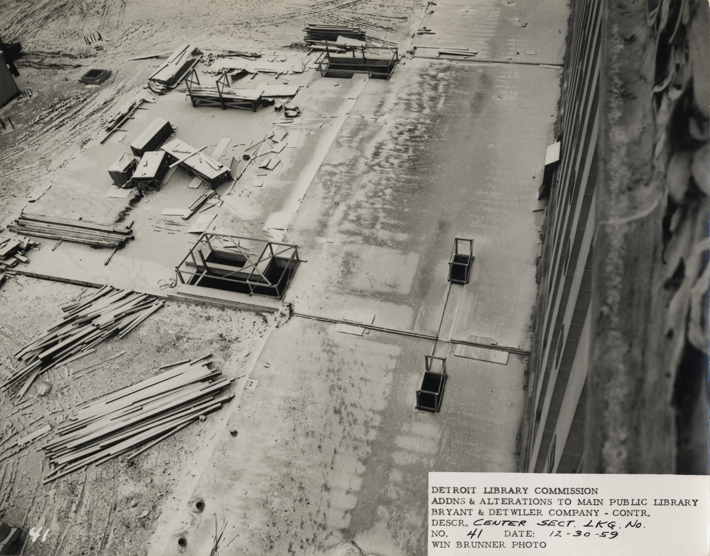 View of auditorium roof and concourse floor, Main Library, Detroit Public Library during construction. Construction materials and equipment on site are covered with snow. Printed on front: "Detroit Library Commission. Addns & alterations to Main Public Library. Bryant & Detwiler Company, contr. Descr. center sect. lkg. no. No. 41. Date: 12-30-59. Win Brunner, photo."