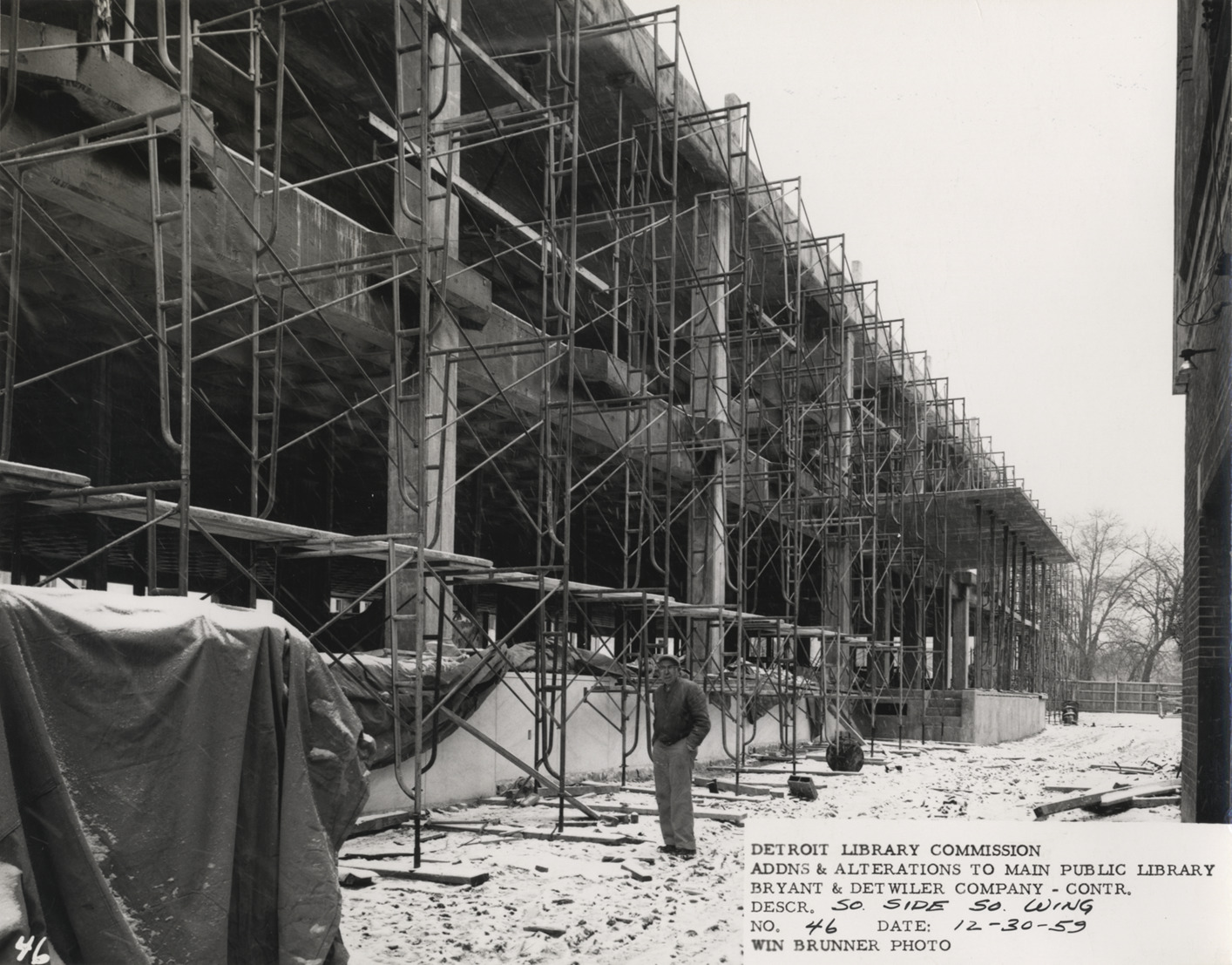 View of workman standing in front of South Wing, Main Library, Detroit Public Library during construction. Scaffolding surrounds structural frame of building. Printed on front: "Detroit Library Commission. Addns & alterations to Main Public Library. Bryant & Detwiler Company, contr. Descr. so. side So. Wing. No. 46. Date: 12-30-59. Win Brunner, photo."