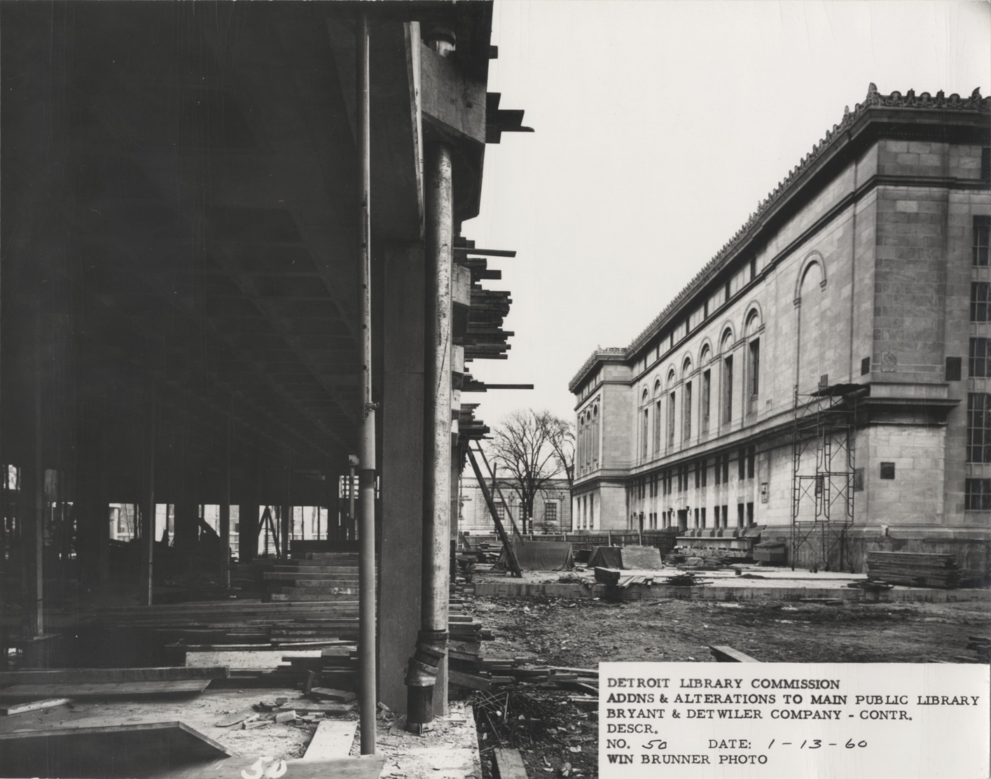 View of North Wing, Main Library, Detroit Public Library during construction. Old library building on right; structural frame of addition on left. Construction materials on ground; Detroit Institute of Arts in background. Printed on front: "Detroit Library Commission. Addns & alterations to Main Public Library. Bryant & Detwiler Company, contr. Descr. [blank]. No. 50. Date: 1-13-60. Win Brunner, photo."