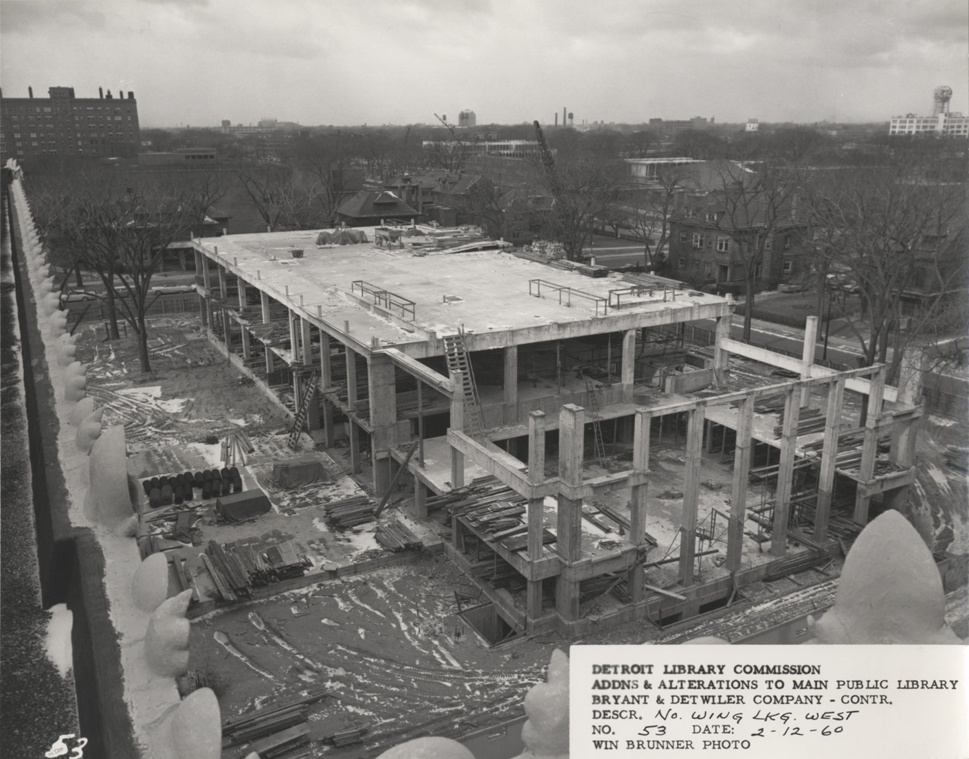 View of North Wing, Main Library, Detroit Public Library during construction, facing west. Structural framework of building; construction materials on site. Wayne State University in background. Printed on front: "Detroit Library Commission. Addns & alterations to Main Public Library. Bryant & Detwiler Company, contr. Descr. No. Wing lkg. west. No. 53. Date: 2-12-60. Win Brunner, photo."