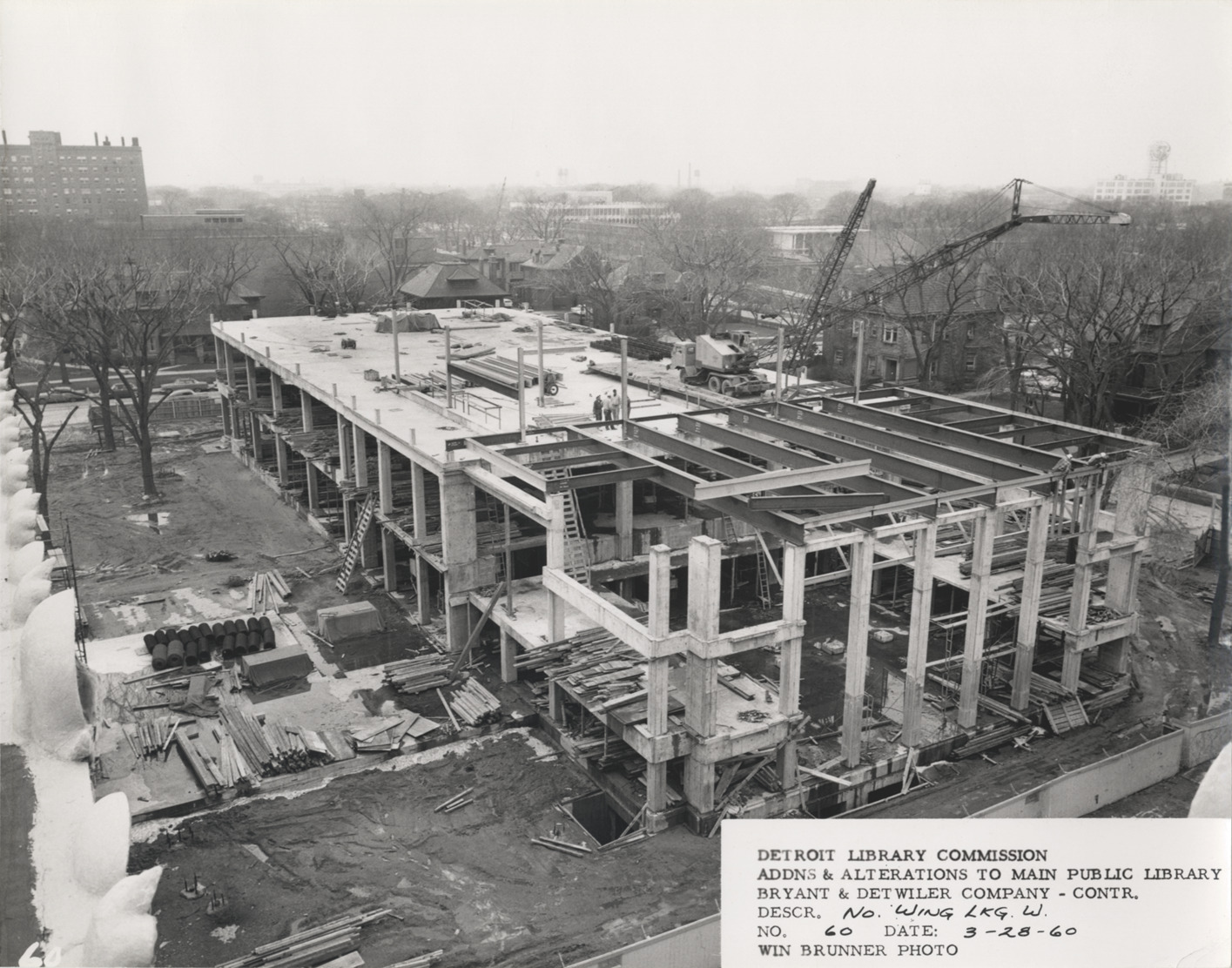 View of North Wing, Main Library, Detroit Public Library during construction, facing west. Construction workers stand with crane on top of structural framework of building; construction materials on site. Printed on front: "Detroit Library Commission. Addns & alterations to Main Public Library. Bryant & Detwiler Company, contr. Descr. No. Wing lkg. west. No. 60. Date: 3-28-60. Win Brunner, photo."