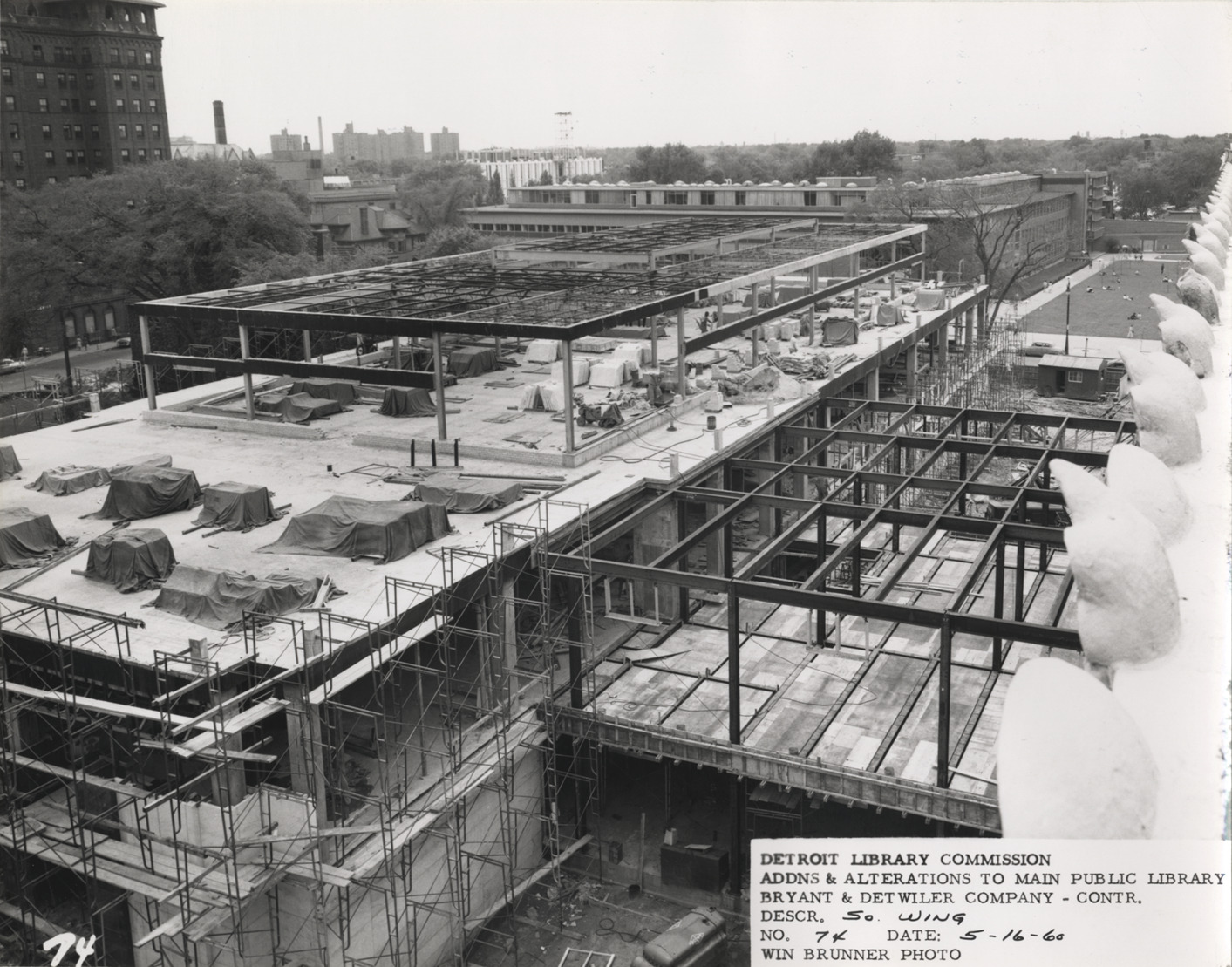 View from above of South Wing, Main Library, Detroit Public Library during construction. Covered construction materials on top of structural framework of building; Wayne State University in background. Printed on front: "Detroit Library Commission. Addns & alterations to Main Public Library. Bryant & Detwiler Company, contr. Descr. So. Wing. No. 74. Date: 5-16-60. Win Brunner, photo."