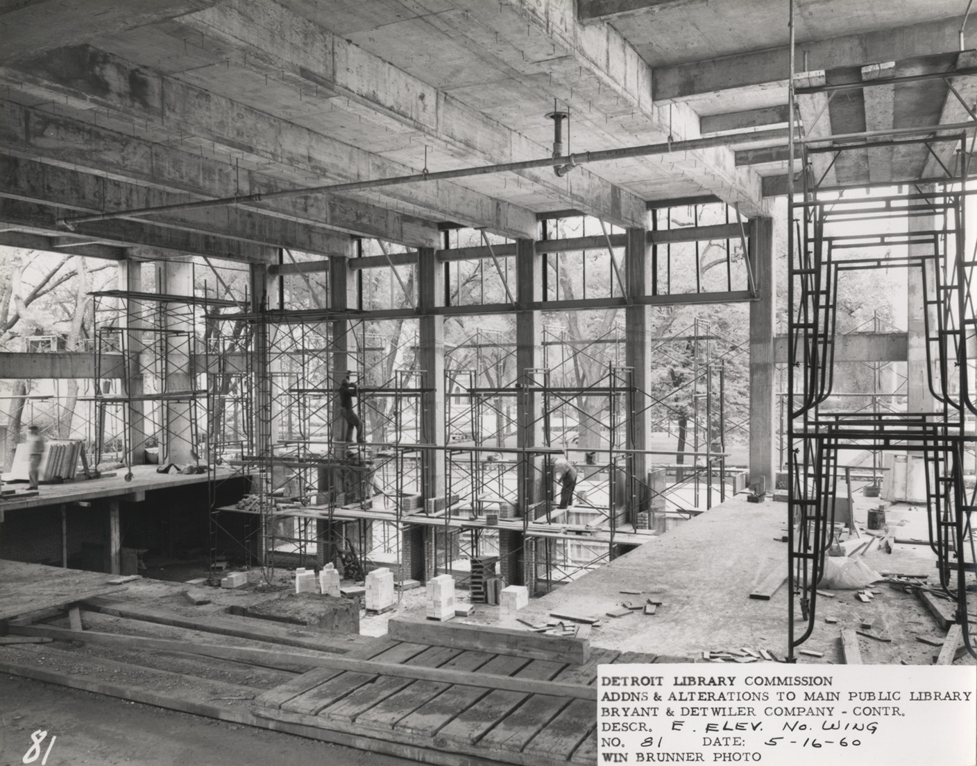 View of the east elevation of North Wing, Main Library, Detroit Public Library during construction. Construction workers climb on scaffolding inside structural framework of building. Printed on front: "Detroit Library Commission. Addns & alterations to Main Public Library. Bryant & Detwiler Company, contr. Descr. e. elev., No. Wing. No. 81. Date: 5-16-60. Win Brunner, photo."
