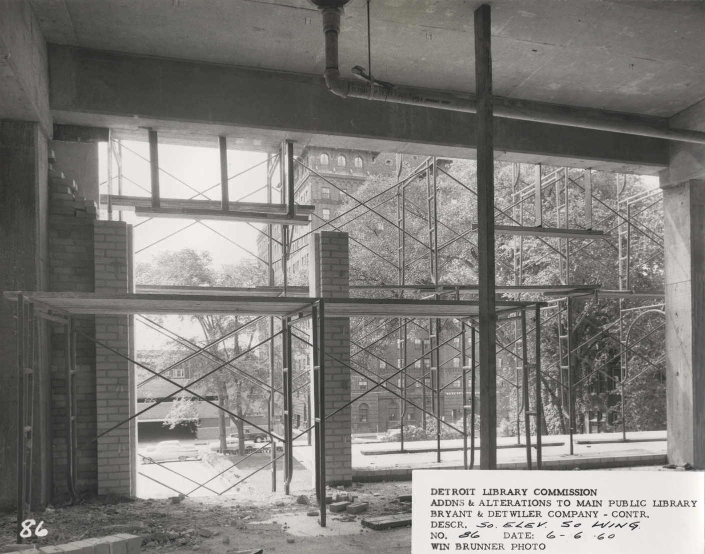 View from inside of South Wing, Main Library, Detroit Public Library during construction. Wayne State University building visible through scaffolding. Printed on front: "Detroit Library Commission. Addns & alterations to Main Public Library. Bryant & Detwiler Company, contr. Descr. so. elev., So. Wing. No. 86. Date: 6-6-60. Win Brunner, photo."