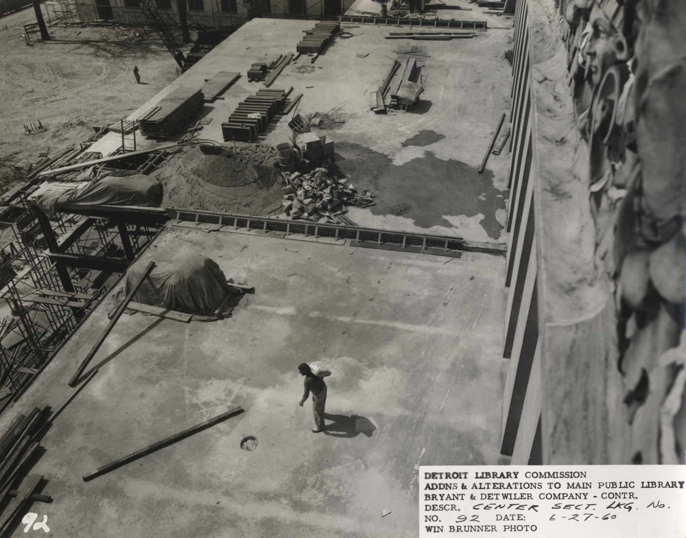 View of construction worker standing on roof of Cass Ave. concourse, Main Library, Detroit Public Library during construction, facing north. Workman carries bag of cement; construction materials on roof. Printed on front: "Detroit Library Commission. Addns & alterations to Main Public Library. Bryant & Detwiler Company, contr. Descr. center sect. lkg. no. No. 92. Date: 6-27-60. Win Brunner, photo." Stamped on back: "Win Brunner, 2210 Park Avenue, Detroit 1, Mich."
