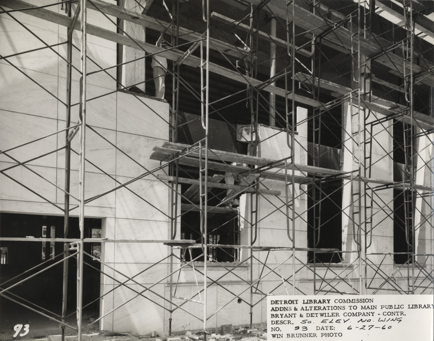 View of construction workers standing on scaffolding in front of North Wing, Main Library, Detroit Public Library during construction. Facade of building is partially complete. Printed on front: "Detroit Library Commission. Addns & alterations to Main Public Library. Bryant & Detwiler Company, contr. Descr. so. elev., No. Wing. No. 93. Date: 6-27-60. Win Brunner, photo." Stamped on back: "Win Brunner, 2210 Park Avenue, Detroit 1, Mich."