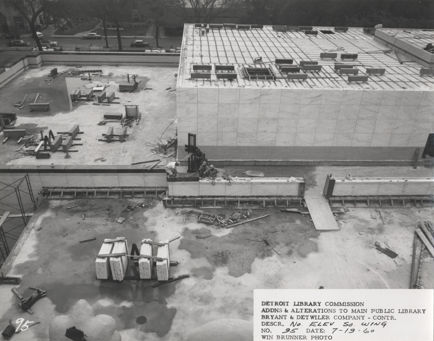 View of roof of South Wing, Main Library, Detroit Public Library during construction. Construction workers and construction materials on roof. Printed on front: "Detroit Library Commission. Addns & alterations to Main Public Library. Bryant & Detwiler Company, contr. Descr. no. elev., So. Wing. No. 95. Date: 7-19-60. Win Brunner, photo."