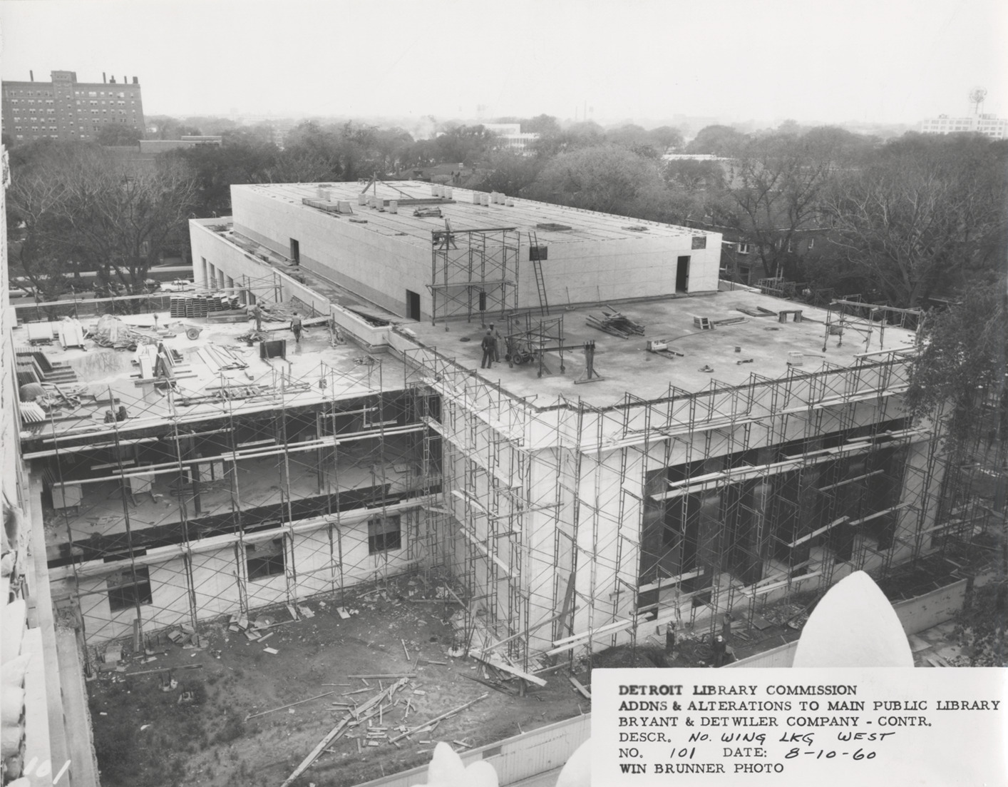 View of North Wing, Main Library, Detroit Public Library during construction, facing west. Scaffolding surrounds structural framework of building; construction workers stand on roof. Printed on front: "Detroit Library Commission. Addns & alterations to Main Public Library. Bryant & Detwiler Company, contr. Descr. No. Wing lkg. west. No. 101. Date: 8-10-60. Win Brunner, photo."
