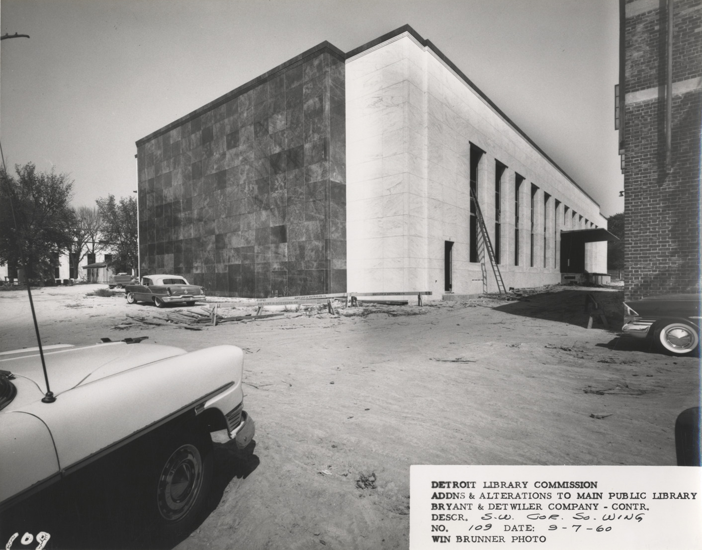 View of southwest corner of South Wing, Main Library, Detroit Public Library during construction. Facade of building is nearly complete; automobiles parked next to building and in foreground. Printed on front: "Detroit Library Commission. Addns & alterations to Main Public Library. Bryant & Detwiler Company, contr. Descr. s.w. cor. So. Wing. No. 109. Date: 9-7-60. Win Brunner, photo."