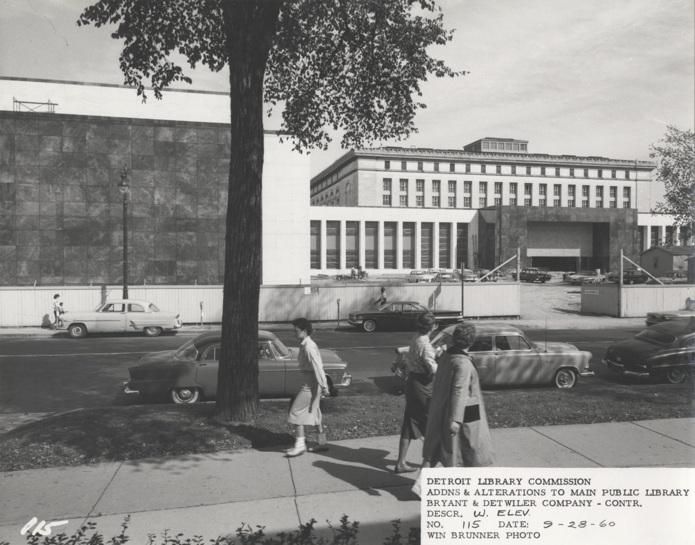 View of west elevation, Main Library, Detroit Public Library during construction. North Wing, Cass Avenue concourse and old library building are visible; automobiles parked on construction site. Pedestrians walk in foreground. Printed on front: "Detroit Library Commission. Addns & alterations to Main Public Library. Bryant & Detwiler Company, contr. Descr. w. elev., no. 115. Date: 9-28-60. Win Brunner, photo."