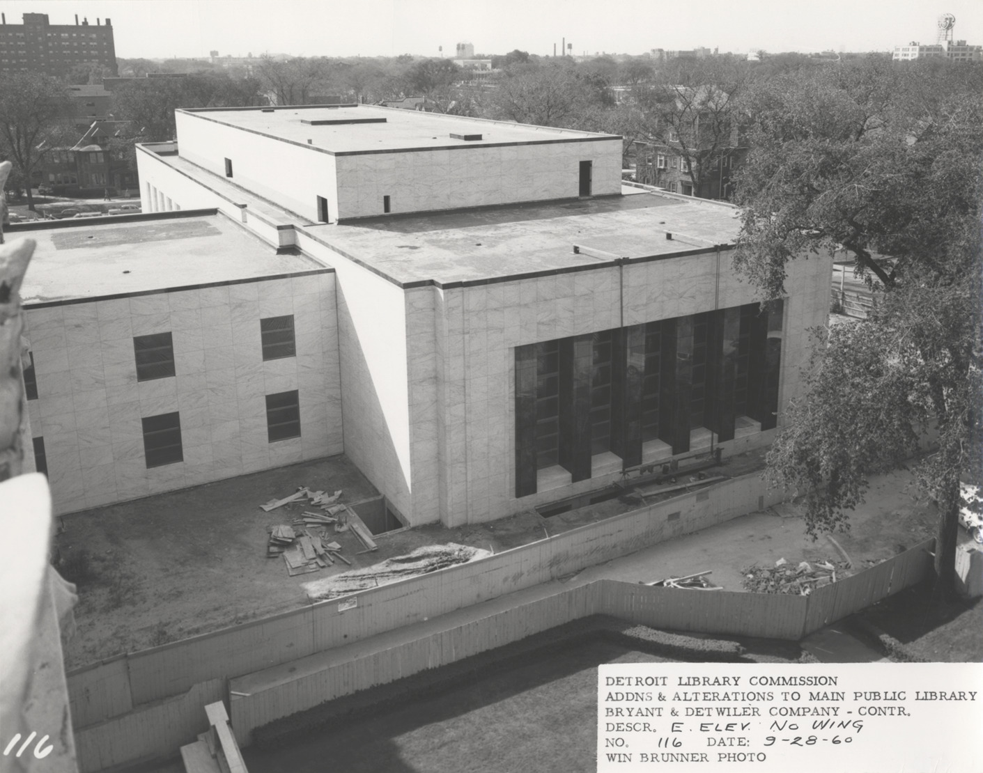 View of the east elevation, North Wing, Main Library, Detroit Public Library during construction. Construction materials and wooden fences in foreground. Printed on front: "Detroit Library Commission. Addns & alterations to Main Public Library. Bryant & Detwiler Company, contr. Descr. e. elev., No. Wing. No. 116. Date: 9-28-60. Win Brunner, photo."