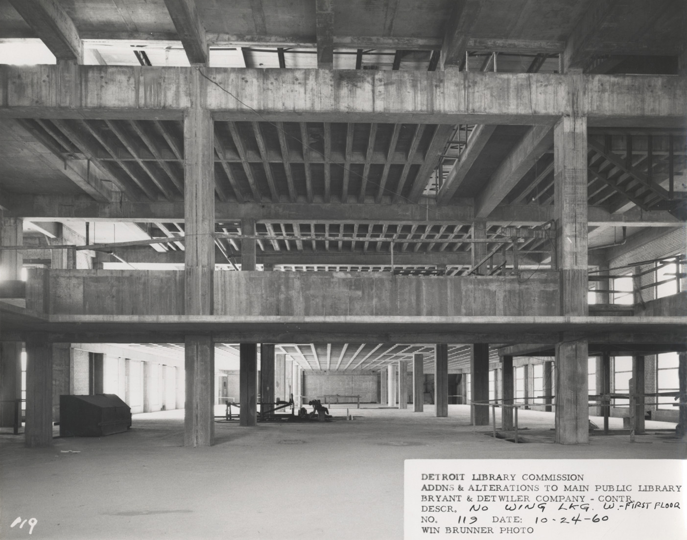 Interior view of first floor, North Wing, Main Library, Detroit Public Library during construction. Printed on front: "Detroit Library Commission. Addns & alterations to Main Public Library. Bryant & Detwiler Company, contr. Descr. No. Wing lkg. w., first floor. No. 119. Date: 10-24-60. Win Brunner, photo."