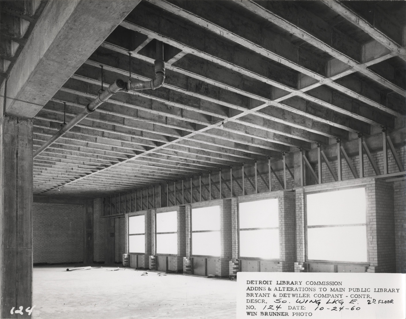 Interior view of second floor, South Wing, Main Library, Detroit Public Library during construction, facing east. Windows and ceiling beams visible. Printed on front: "Detroit Library Commission. Addns & alterations to Main Public Library. Bryant & Detwiler Company, contr. Descr. So. Wing lkg. e., 2d floor. No. 124. Date: 10-24-60. Win Brunner, photo."