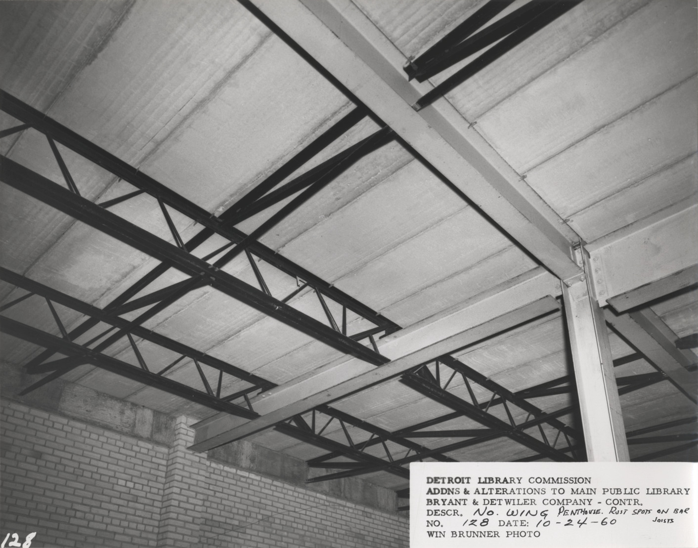 Interior view of joists and ceiling beams in penthouse, North Wing, Main Library, Detroit Public Library during construction. Printed on front: "Detroit Library Commission. Addns & alterations to Main Public Library. Bryant & Detwiler Company, contr. Descr. No. Wing penthouse, rust spots on bar joists. No. 128. Date: 10-24-60. Win Brunner, photo."