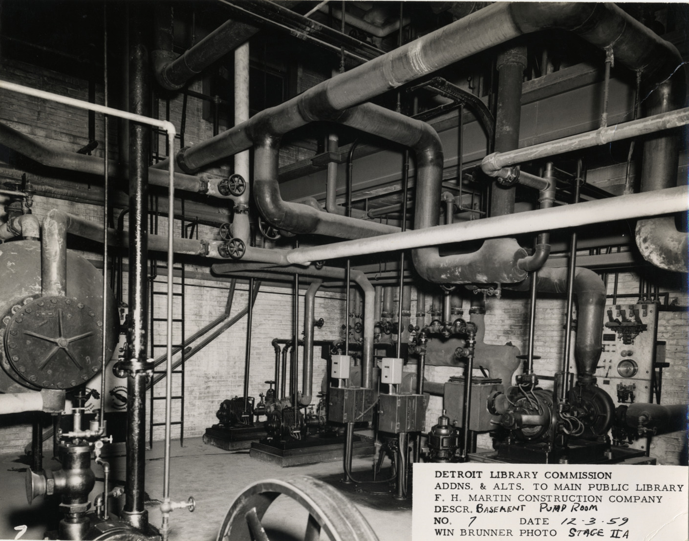 View of basement pump room, Main Library, Detroit Public Library during construction. Printed on front: "Detroit Library Commission. Addns. & alts. to Main Public Library. F.H. Martin Construction Company. Descr. basement pump room. No. 7. Date: 12-3-59. Win Brunner, photo. Stage IIA."