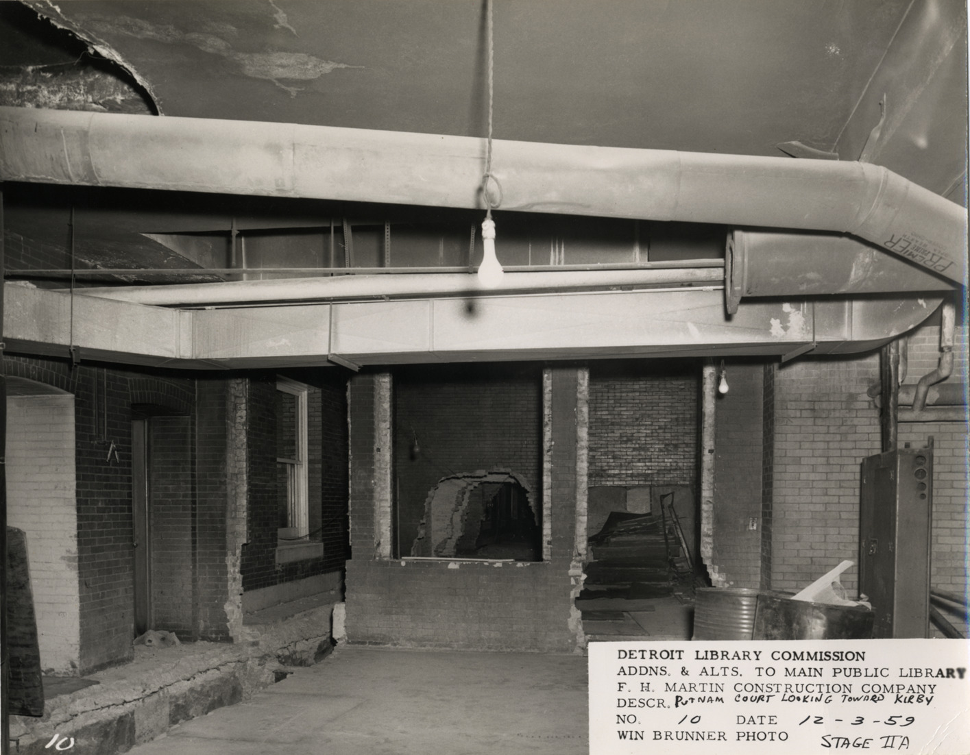 View of Putnam court, Main Library, Detroit Public Library during construction. Brick walls partially demolished. Printed on front: "Detroit Library Commission. Addns. & alts. to Main Public Library. F.H. Martin Construction Company. Descr. Putnam court looking toward Kirby. No. 10. Date: 12-3-59. Win Brunner, photo. Stage IIA."